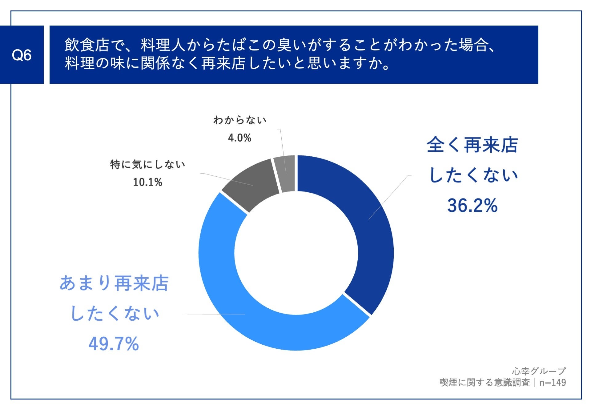 「Q6.飲食店で、料理人からたばこの臭いがすることがわかった場合、料理の味に関係なく再来店したいと思いますか。」(n=149)と質問したところ、「全く再来店したくない」が36.2%、「あまり再来店したくない」が49.7%という回答となりました。