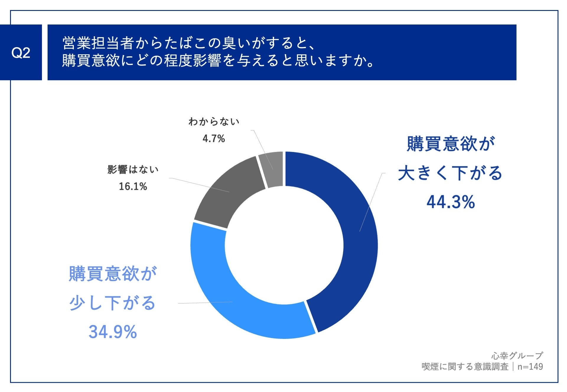 「Q2.営業担当者からたばこの臭いがすると、購買意欲にどの程度影響を与えると思いますか。」(n=149)と質問したところ、「購買意欲が大きく下がる」が44.3%、「購買意欲が少し下がる」が34.9%という回答となりました。