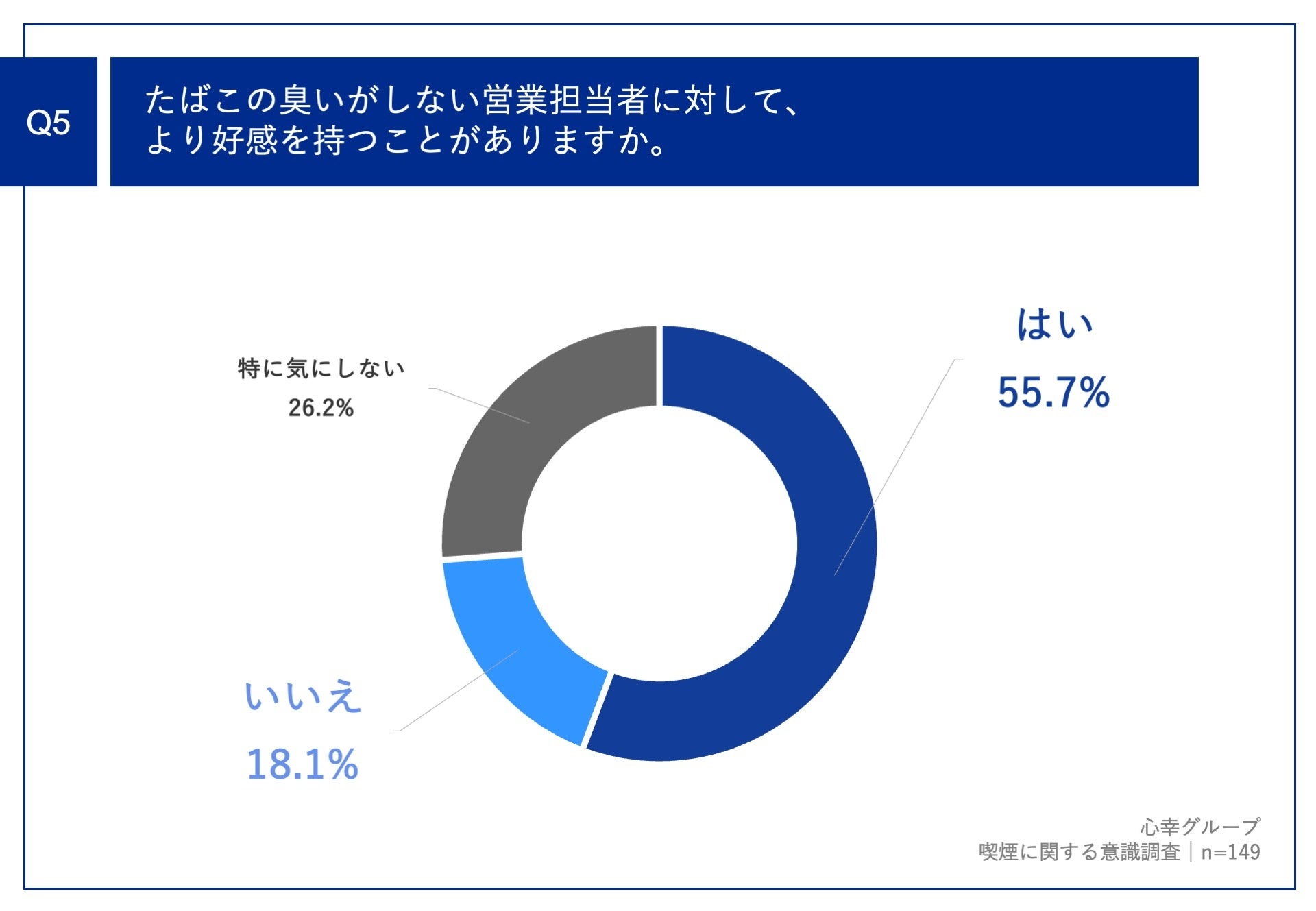 「Q5.たばこの臭いがしない営業担当者に対して、より好感を持つことがありますか。」(n=149)と質問したところ、「はい」が55.7%、「いいえ」が18.1%という回答となりました。