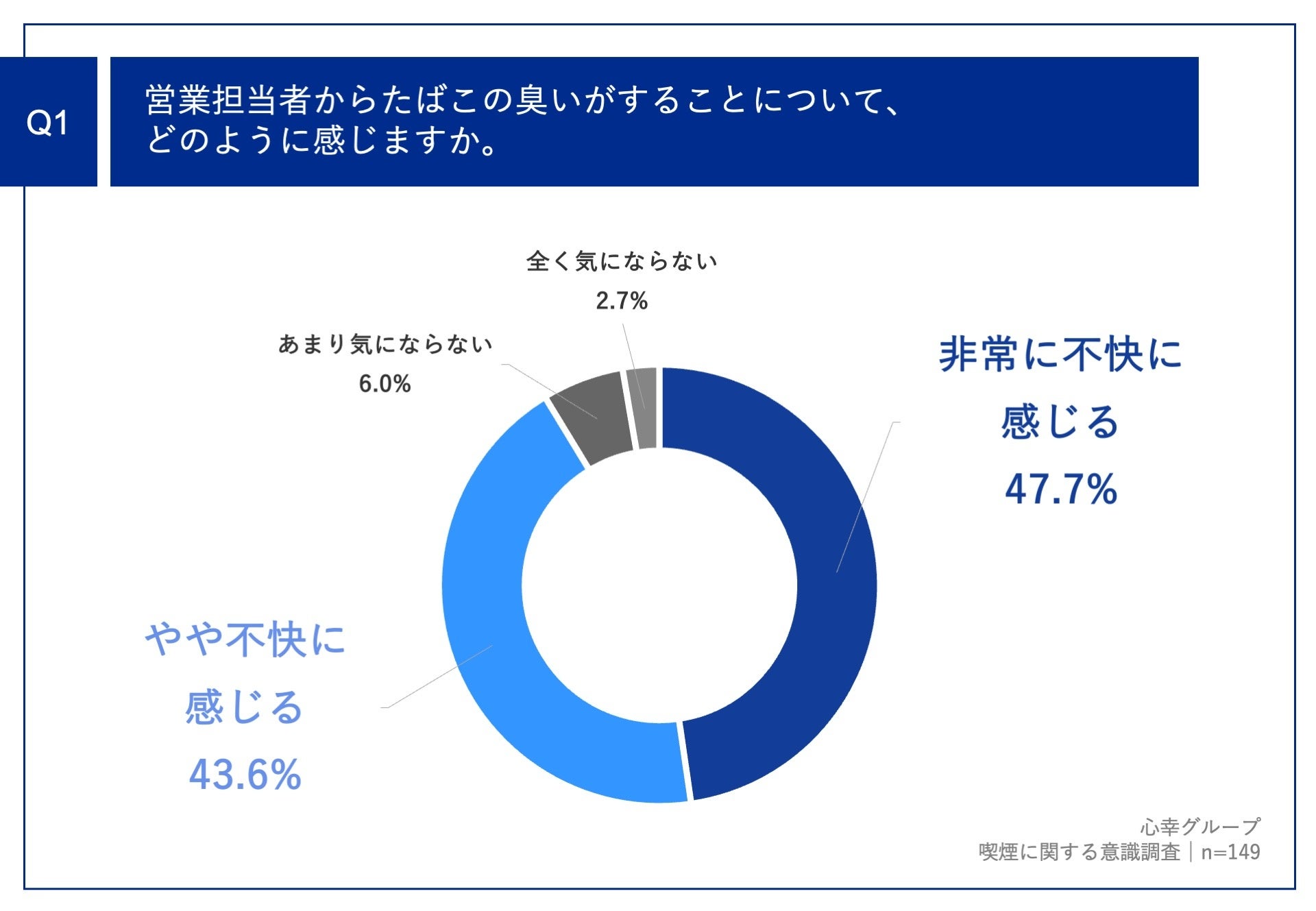 「Q1.営業担当者からたばこの臭いがすることについて、どのように感じますか。」(n=149)と質問したところ、「非常に不快に感じる」が47.7%、「やや不快に感じる」が43.6%という回答となりました。