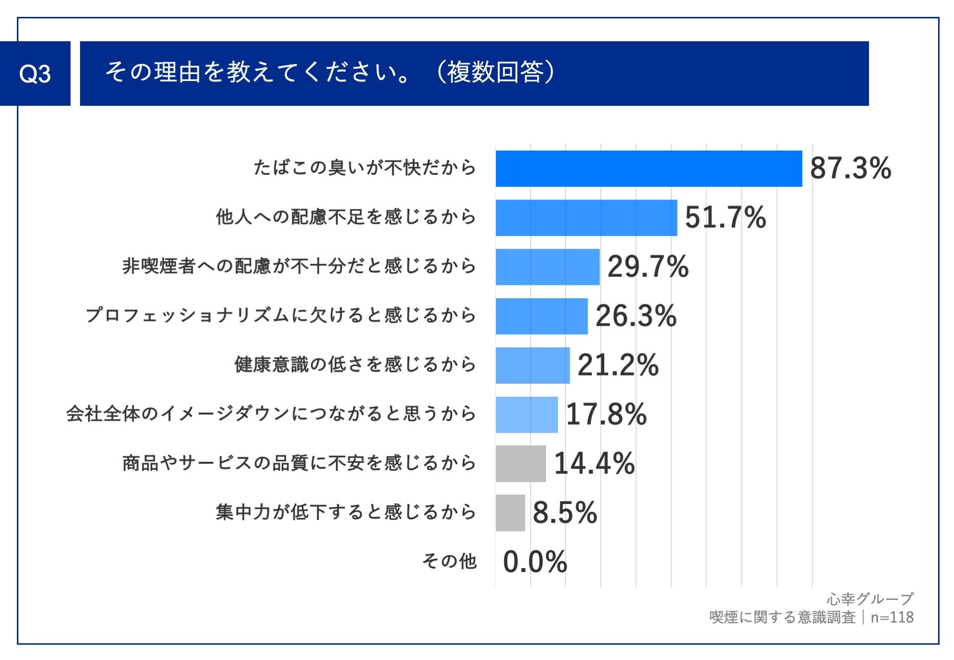 Q2で「購買意欲が大きく下がる」「購買意欲が少し下がる」と回答した方に、「Q3.その理由を教えてください。(複数回答)」(n=118)と質問したところ、「たばこの臭いが不快だから」が87.3%、「他人への配慮不足を感じるから」が51.7%、「非喫煙者への配慮が不十分だと感じるから」が29.7%という回答となりました。