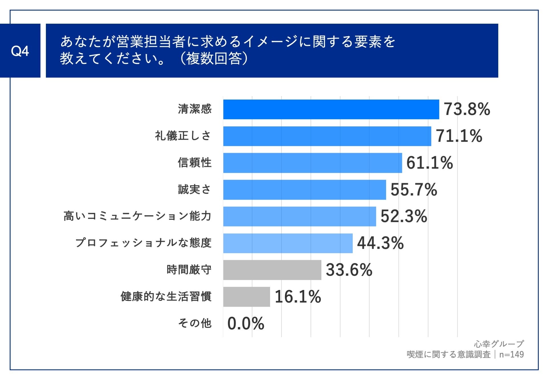 「Q4.あなたが営業担当者に求めるイメージに関する要素を教えてください。(複数回答)」(n=149)と質問したところ、「清潔感」が73.8%、「礼儀正しさ」が71.1%、「信頼性」が61.1%という回答となりました。