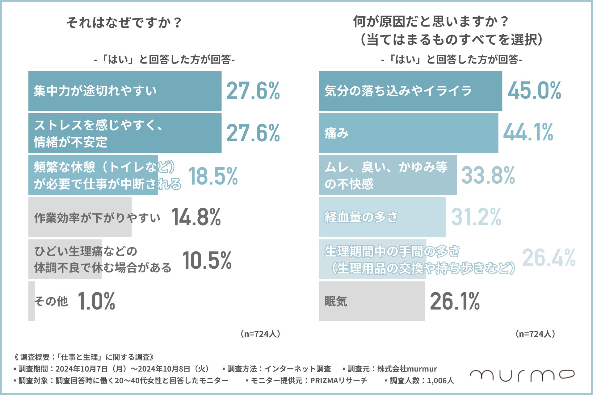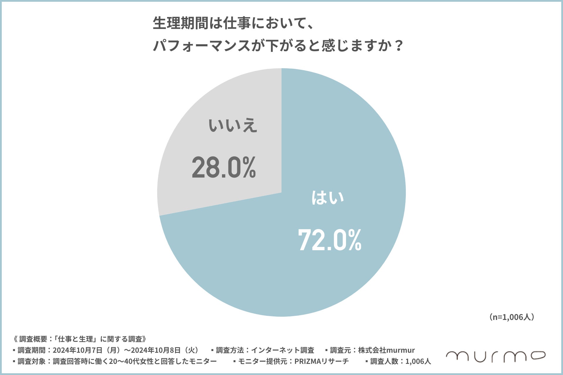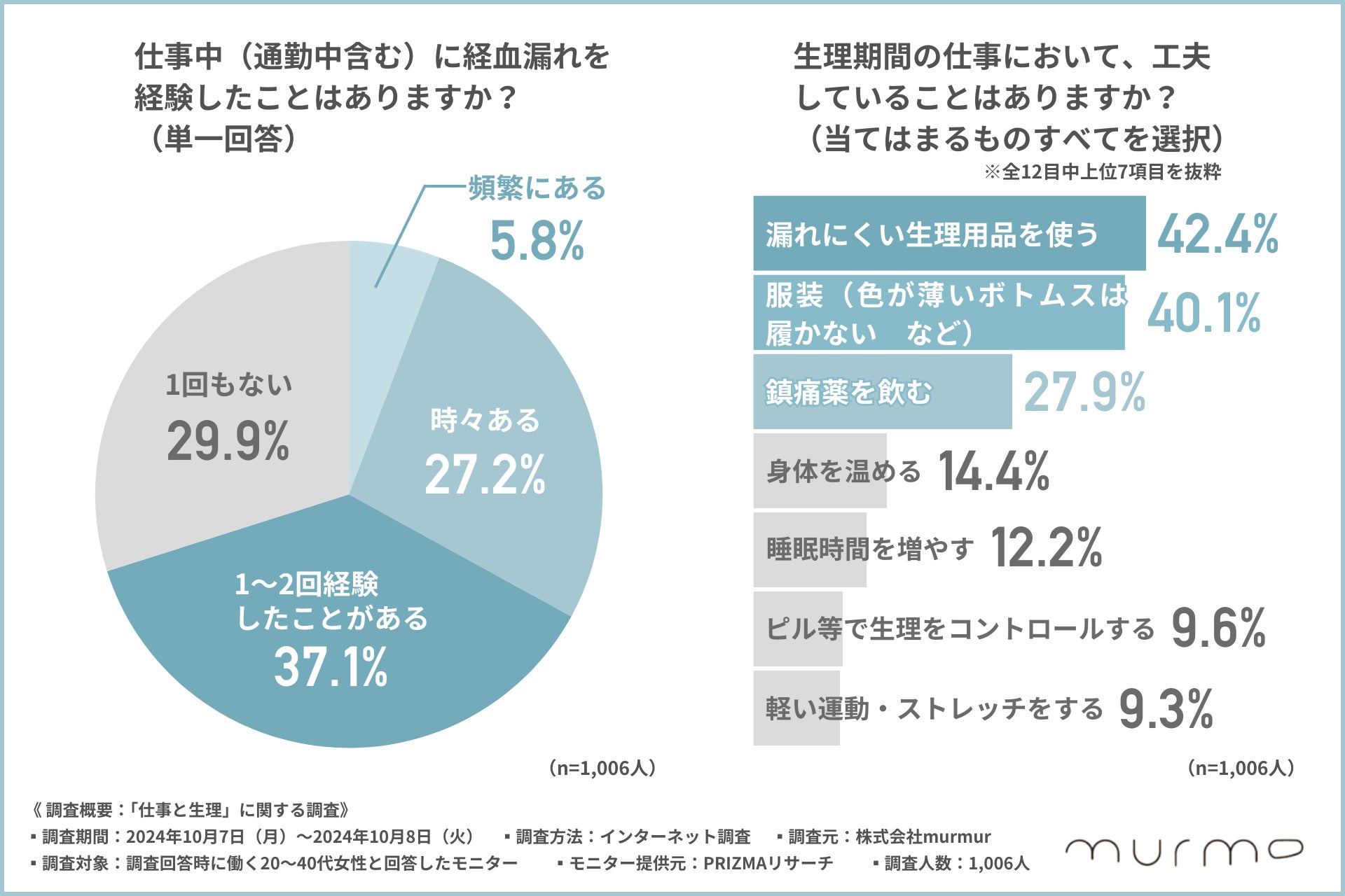 日本製月経カップブランド「murmo/マーモ」(https://murmo.jp)を展開する、株式会社murmur(本社所在地:東京都品川区、代表取締役CEO:高島 華子)は、働く20〜40代女性を対象に「仕事と生理」に関する調査を実施しました。