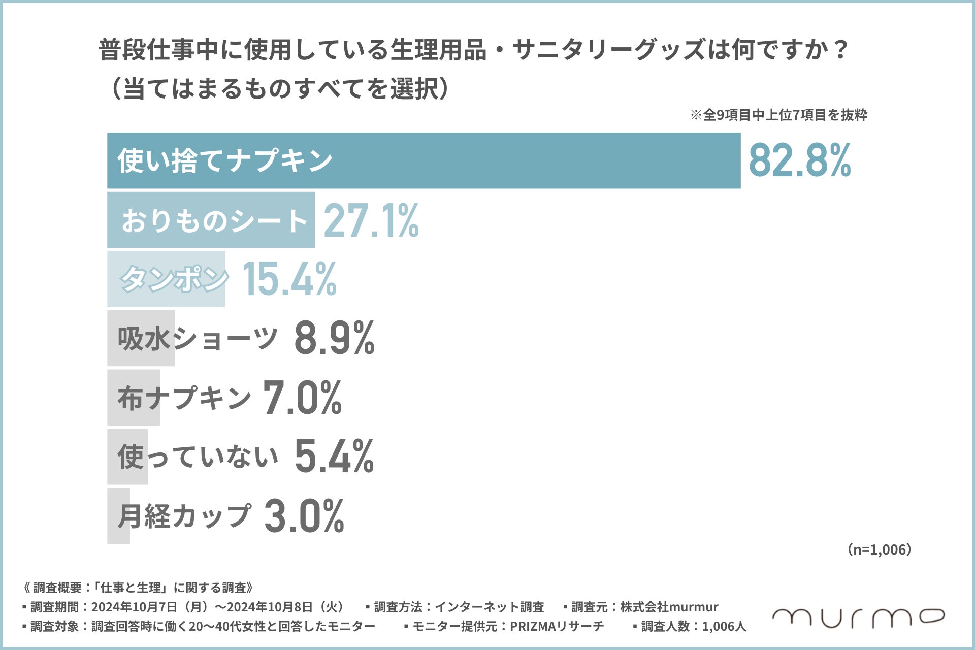 「普段仕事中に使用している生理用品・サニタリーグッズは何ですか?(当てはまるものすべてを選択)」と質問したところ、『使い捨てナプキン(82.8%)』が圧倒的に多く、『おりものシート(27.1%)』『タンポン(15.4%)』と続きました。