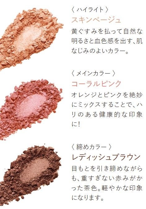 大人の気になる肌のくすみを計算して、明るく華やかな目もとを演出する色みを採用しました。中央のカラーは、目もとに血色感をプラスして生き生きと健康的な印象を演出します。