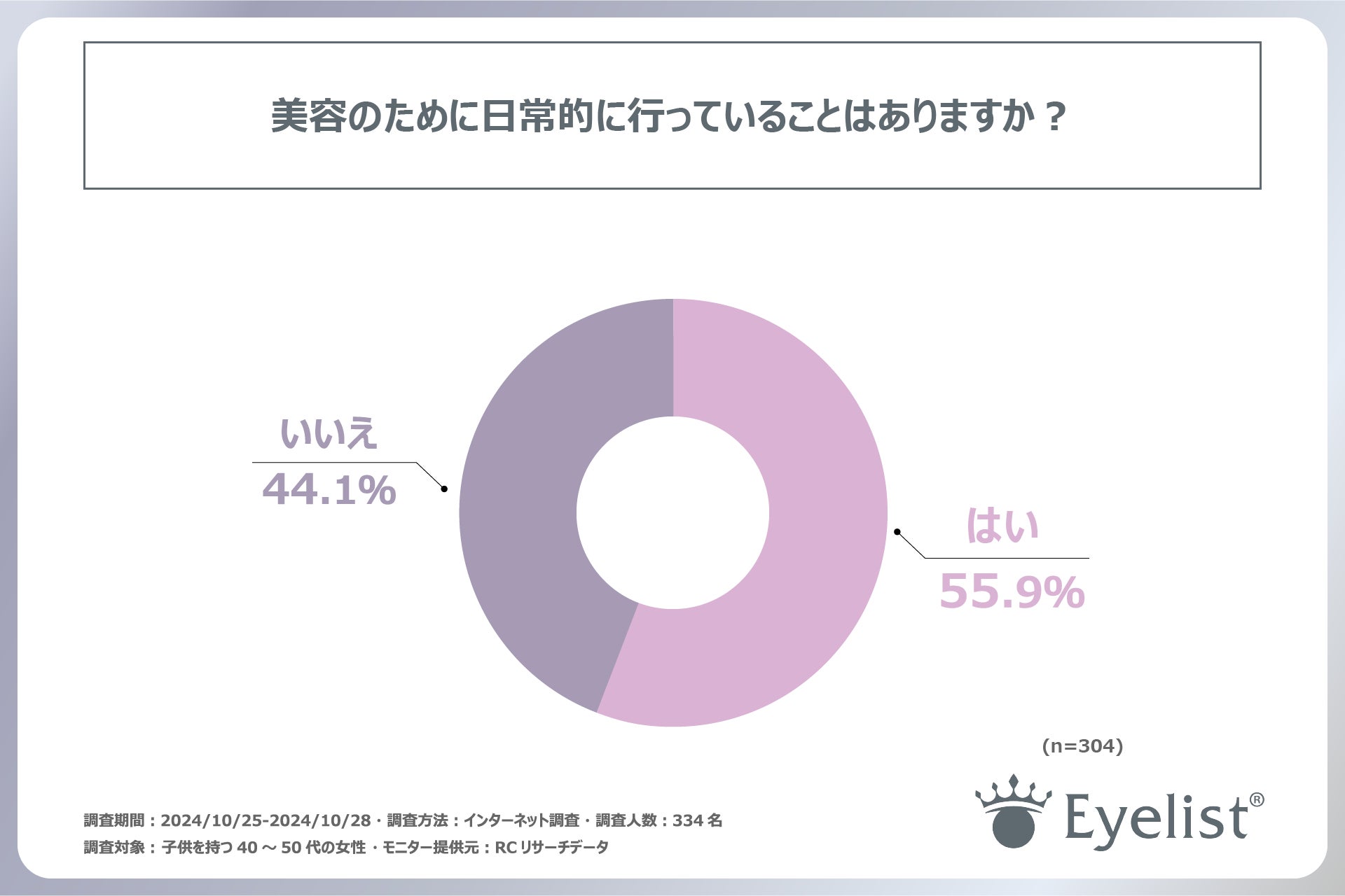 続いて「外出や人と会う際に、外見に気を使う」と回答された方に「美容のために日常的に行っていることはあるか」を尋ねる設問への回答では、「はい」が55.9%と多数派を占める結果となりました。この結果から、外見に気を使われる人の半数以上は、日常的に何らか美容のために行っていることがあることがわかりました。
