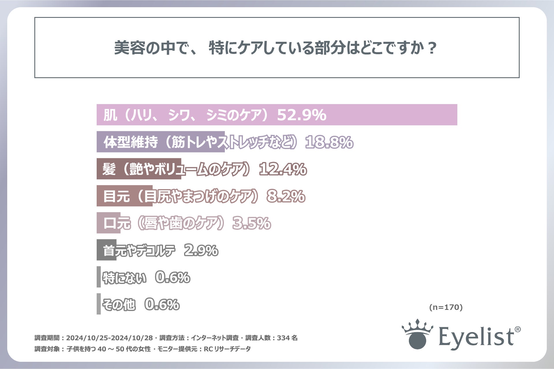 また、「美容のために日常的に行っていることがある」と回答された方に「美容の中で、特にケアしている部分はどこか」を問う設問への回答では、1位が「肌(ハリ、シワ、シミのケア)」で52.9%、次いで2位が「体型維持(筋トレやストレッチなど)」で18.8%、3位が「髪(艶やボリュームのケア)」で12.4%という結果となりました。この結果から、美容の中で、特にケアしている部分としては、圧倒的に「肌」が多いことが明らかになりました。