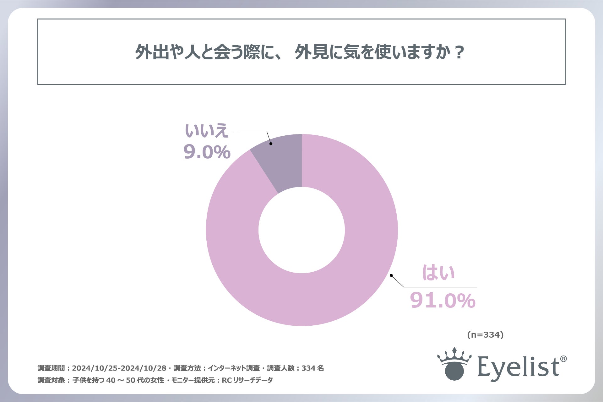 まず、「外出や人と会う際に、外見に気を使うか」を尋ねる設問への回答では、「はい」が91.0%と圧倒的に多い結果となりました。この結果から子供を持つ40~50代女性の9割以上が外出や人と会う際に、外見に気を使うことが判明しました。