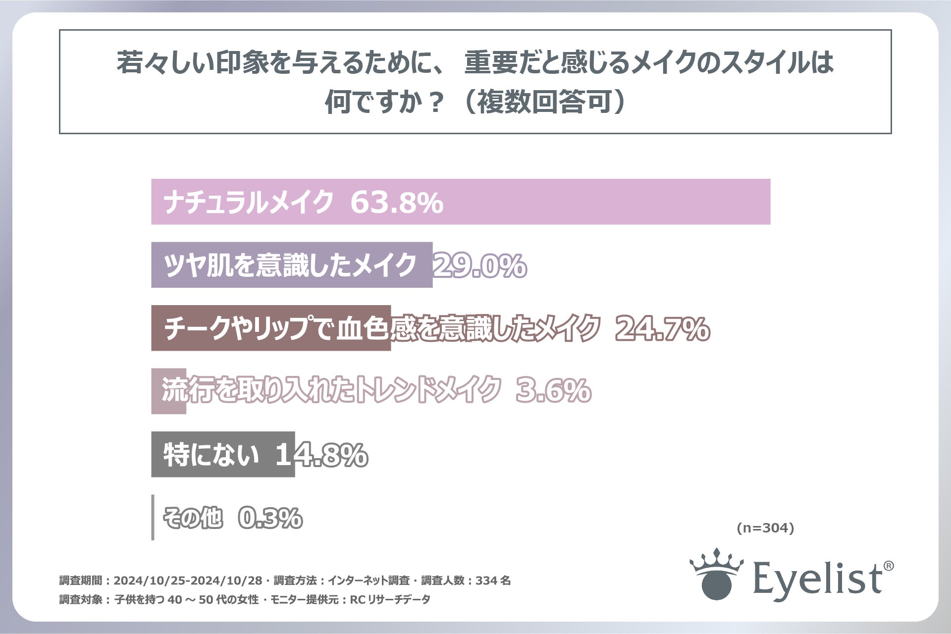 調査の最後に「外出や人と会う際に、外見に気を使う」と回答された方に「若々しい印象を与えるために、重要だと感じるメイクのスタイルは何か」を尋ねる設問の回答では、1位が「ナチュラルメイク」で63.8%、2位が「ツヤ肌を意識したメイク」で29.0%、3位が「チークやリップで血色感を意識したメイク」で24.7%となりました。この結果から、若々しい印象を与えるためのメイクのスタイルは「ナチュラルメイク」であると感じている方が多いことがわかりました。