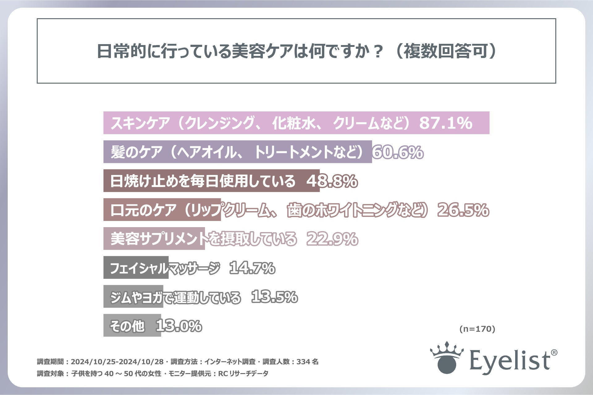 今回の調査結果から、子供を持つ40~50代女性の9割以上が外出や人に会う際に、外見に気を使っており、特に外見に気を使う場面は「友人や知人とのランチ・食事会」であることが明らかになりました。また、外出や人と会う際に、外見に気を使う40~50代女性の約55%が美容のために日常的に行っていることがあり、最もケアをしている部分は「肌」で、美容のために日常的に行っていることで最も多いのは「スキンケア(クレンジング、化粧水、クリームなど)」であることが判明しました。また、外出や人と会う際に、外見に気を使う40~50代女性が、若々しい印象を与えるために重要だと感じるメイクのスタイルは「ナチュラルメイク」であることがわかりました。