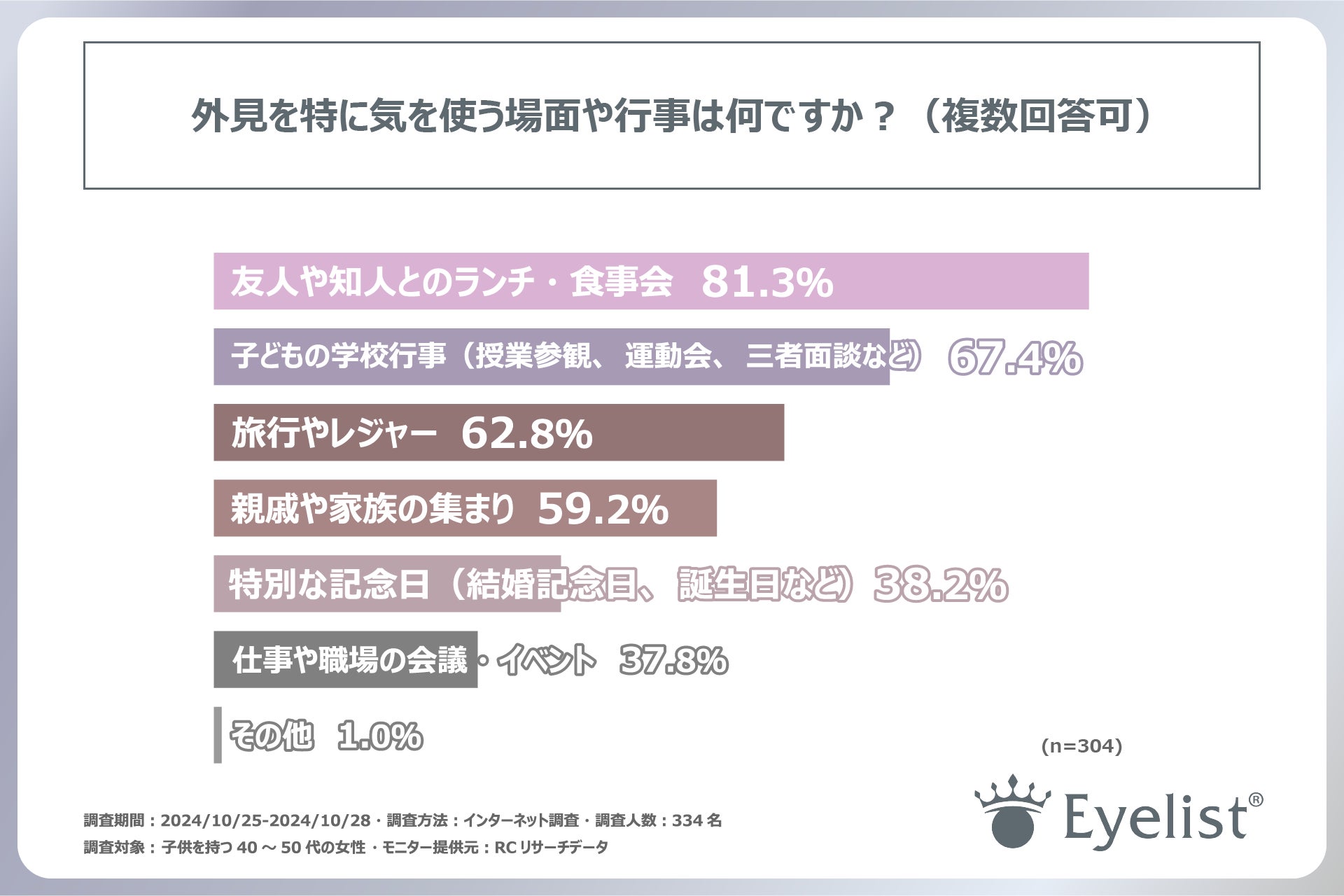 この調査結果から、子供を持つ40~50代の女性がどのような場面で外見の見られ方を気にするか等が明らかになりました。