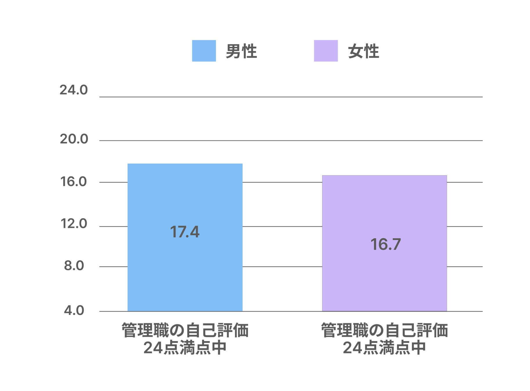 まず「健康課題への理解」「健康に困る部下をサポートする認識」「現場での適切なサポート力」「相談しやすい雰囲気作り」「自社のアセット把握度」「自社のアセットの利用促進力」の6つの観点について、24点満点(4点×6問)で自己評価をしてもらったところ、男女ともにリテラシースコアに差は殆どありませんでした。