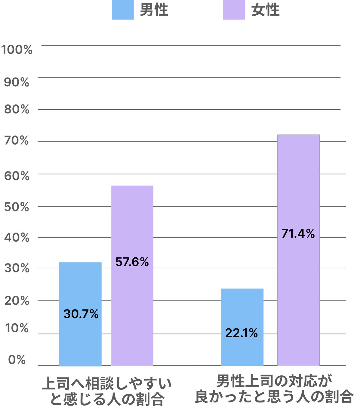 全ての導入企業で、男性の方が「【同性の】上司へ相談しやすい」と感じる人が女性よりも少なく、また相談した際の「【同性の】上司の対応に対する評価」も男性の方が女性よりも低いのが実態です。同性のため、異性の上司の場合よりも抵抗感が少なくなると考えられるものの、男性も男性上司へ相談しづらいと思う人が女性同士に比べて多くなりました。