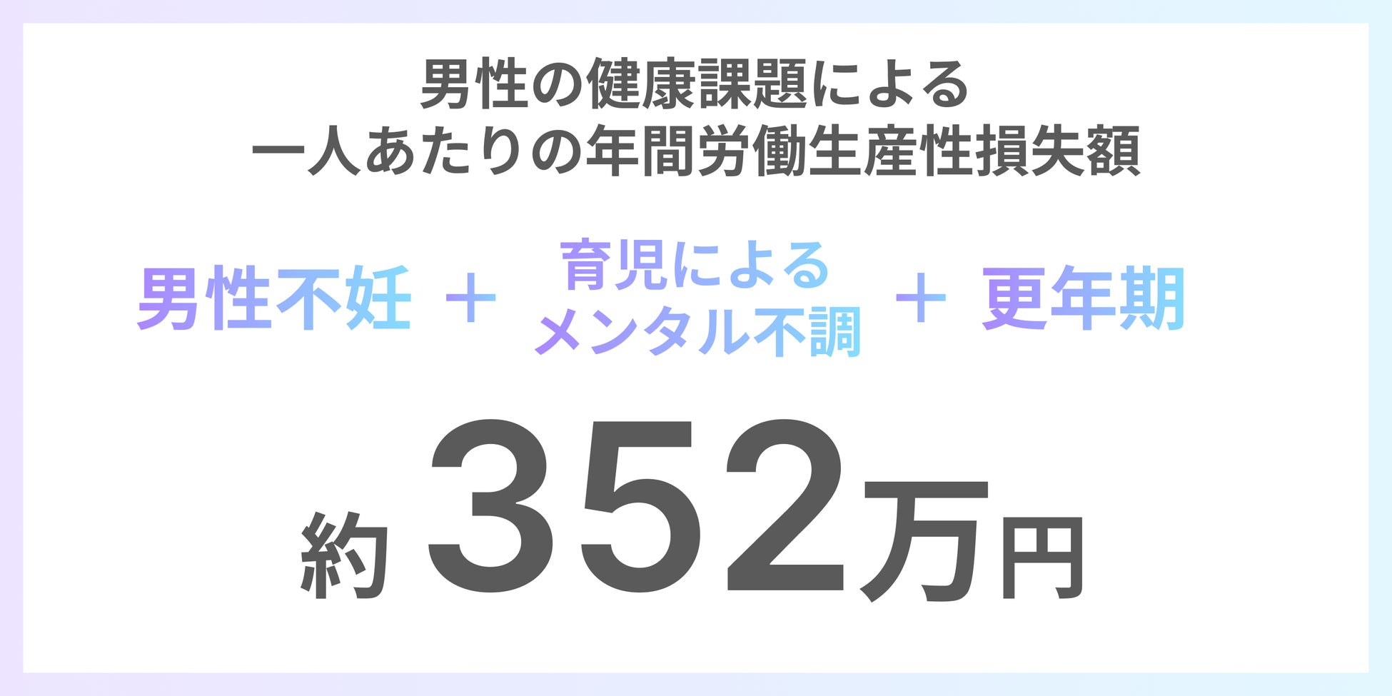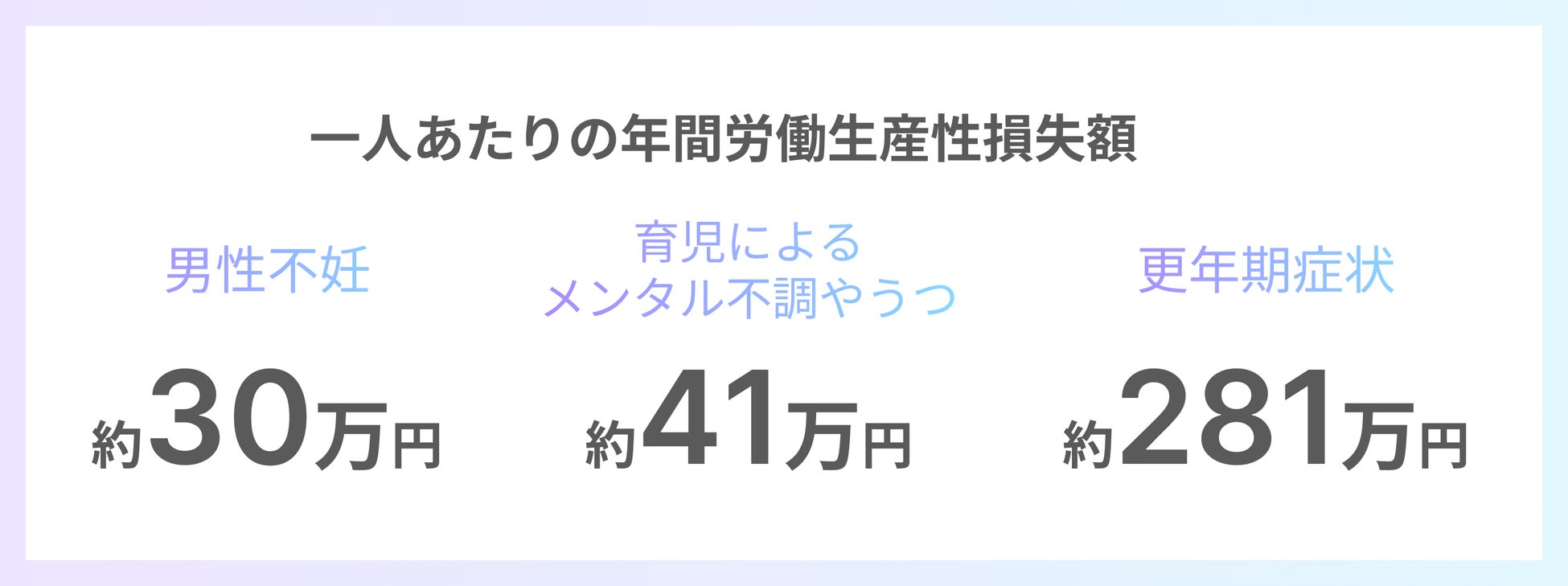 金額にすると、1人あたりの推計年間労働生産性損失額は、平均的に男性不妊30万円、育児によるメンタル不調や鬱が41万円、更年期症状が281万円です。
