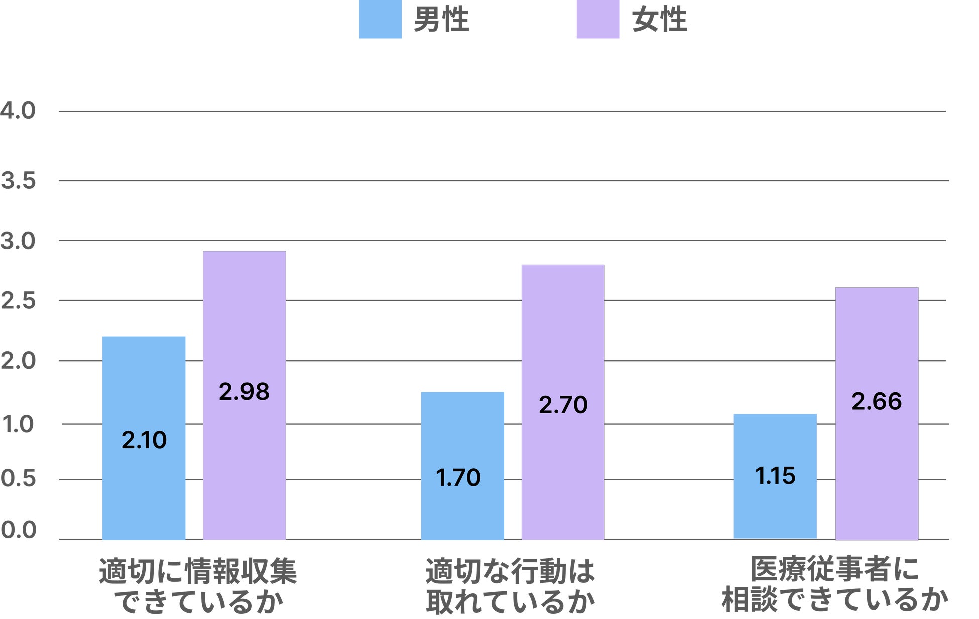 例えば、同程度の更年期に関するリテラシーについて「適切に情報収集できているか」「適切な行動は取れているか」「医療従事者に相談できているか」の3点について、それぞれ4点満点で回答してもらったところ、女性の平均点が情報収集2.98点、行動2.70点、医療2.66点に対し、男性は2.10点、1.70点、1.15点と、全てにおいて大きく差が開きました。