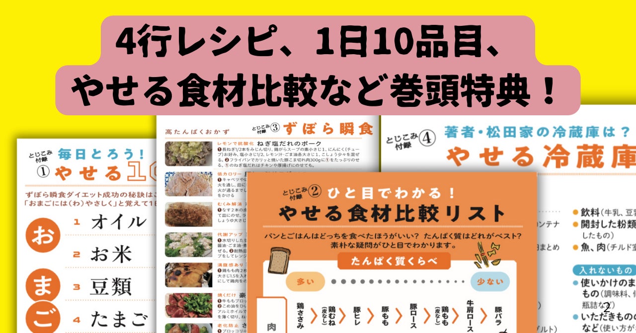 4行レシピ40品、1日10品目、やせる食材比較リストなど4大とじこみ特典も!