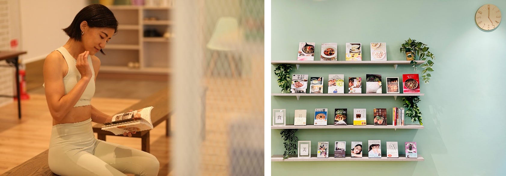 運動の合間には、運動・美・食・暮らしをテーマに代官山 蔦屋書店のコンシェルジュが選書した本を40冊揃え、レッスンの前後などに読書をお楽しみいただけます。店内の本棚には毎月7~10冊ずつ追加され、常時100冊程度の書籍がお読みいただけるようになる予定です。