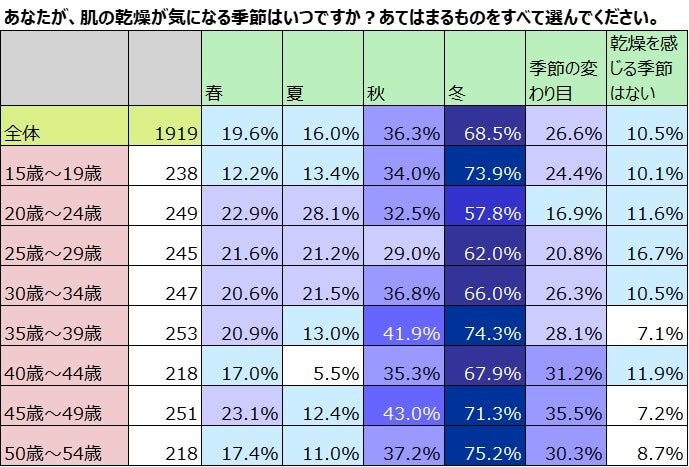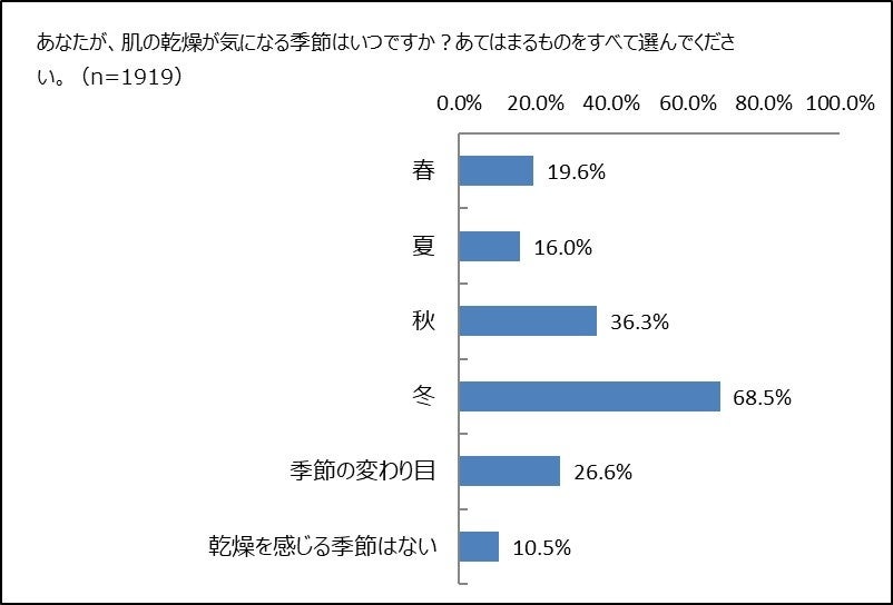 乾燥が気になる季節、冬以外のすべての季節で最も乾燥を感じている割合が高い。