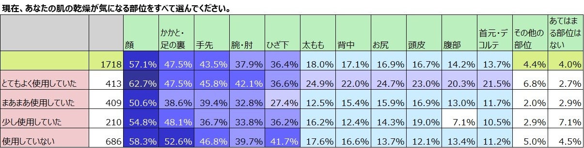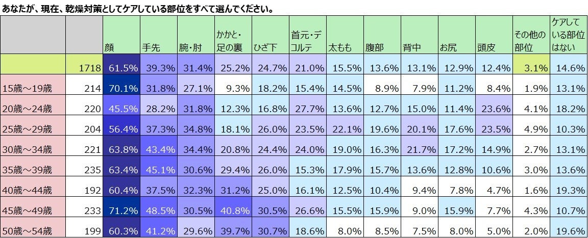 乾燥対策のボディケア、若年層は上半身・高齢層は下半身。乾燥が気になる部位で、最もケアしているのは「かかと」