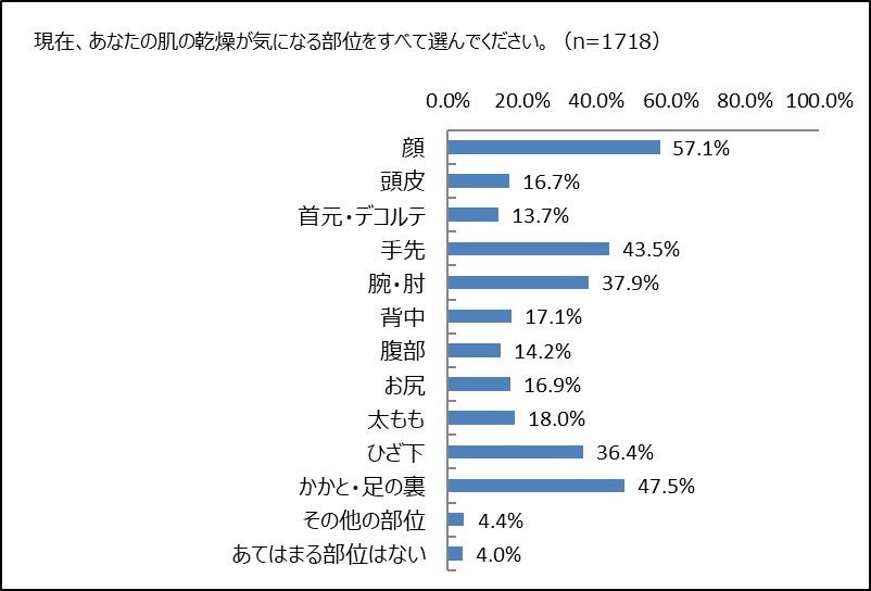 現在、乾燥が気になる部位を聞きました。全体では、1位が「顔」57.1%、2位が「かかと・足の裏」47.5%、3位は「手先」43.5%という結果でした。