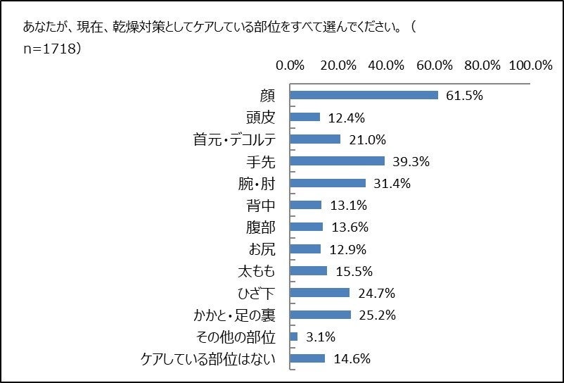 現在、乾燥対策として肌のケアをしている部位を聞きました。全体では「顔」が1位で61.5%、2位は「手先」39.3%、3位は「腕・肘」31.4%。これら以外の部位は3割未満でした。