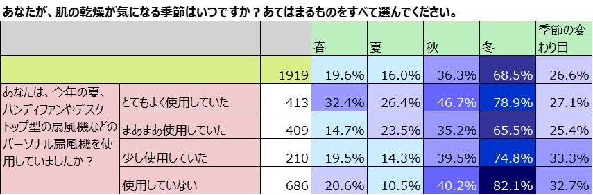 ③夏にハンディファンを多用した人ほど、秋に肌の乾燥を感じている。