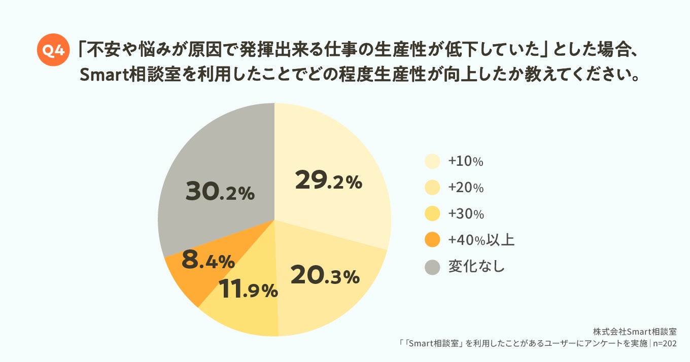 Smart相談室の利用経験がある方に対して、「『不安や悩みが原因で発揮出来る仕事の生産性が低下していた』とした場合、Smart相談室を利用したことでどの程度生産性が向上したか」について調査したところ、約7割の方が10%以上生産性が向上したと回答しました。8%の方は、Smart相談室の利用によって生産性が1.4倍になったと回答しており、悩みや不安を相談することで個人の生産性が大きく向上するケースもあると考えられます。個人の生産性向上は組織の生産性向上につながるため、従業員の不安や悩みに対処していくことが、企業にとっても重要と言えるでしょう。
