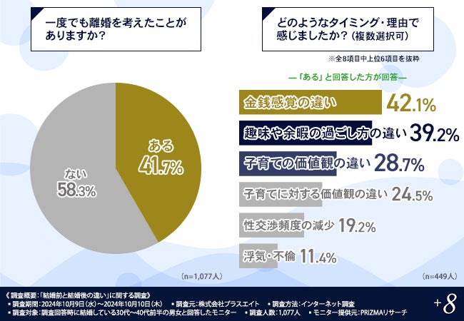 パートナーとの金銭感覚、趣味や余暇の過ごし方、子育ての価値観の違いなどから、一度は離婚を考えたことがある方も約4割いることが判明しました。