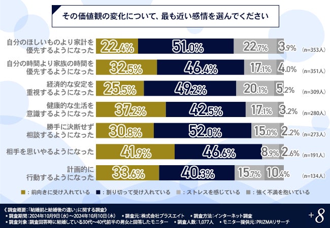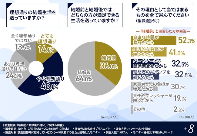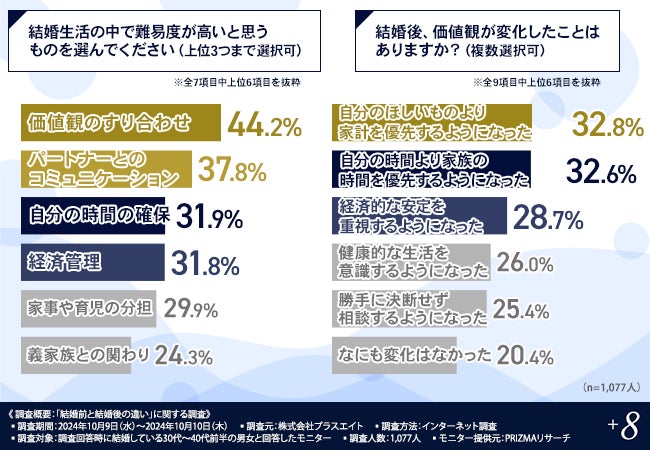 株式会社プラスエイト(所在地:東京都新宿区、代表取締役社長:佐々木 啓介)は、結婚している30代~40代前半の男女を対象に、「結婚前と結婚後の違い」に関する調査を実施しました。