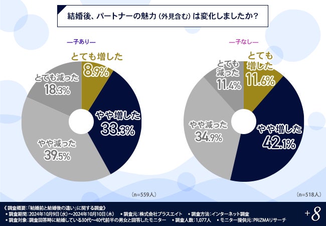 さらに、結婚後のパートナーの魅力について、子なしの方のほうが魅力が増したと思う方が多い結果になり、約6割の方が今でもパートナーを異性として見ているようです。