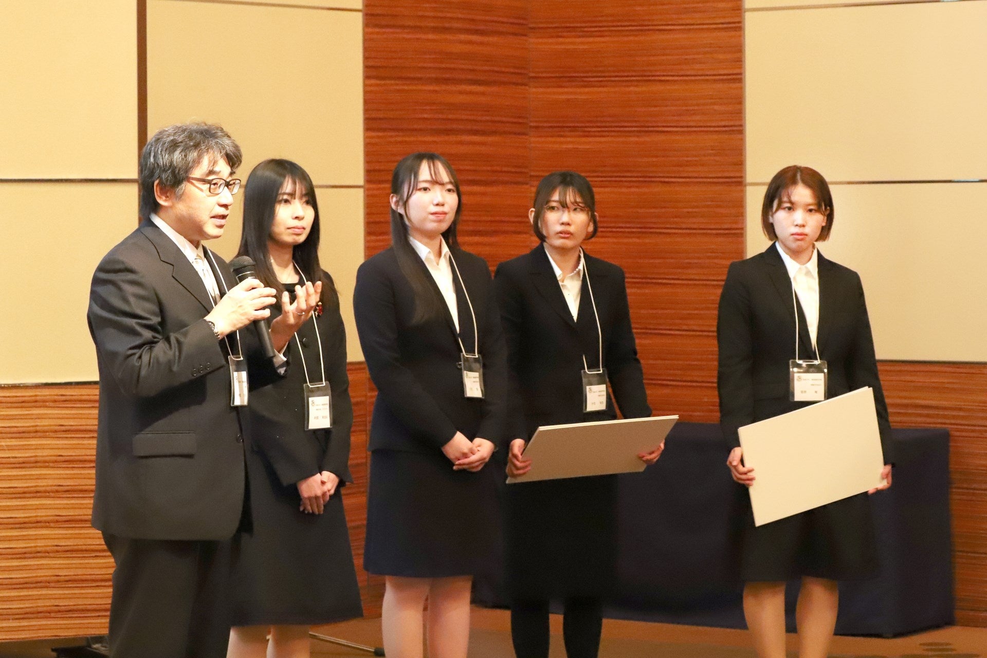 式典では宮城大学とコラボレーションをして作成した50周年記念ロゴの発表も行われました。宮城大学、事業構想学群、伊藤研究室の伊藤真市准教授とその研究室所属の学生によって作成されたロゴの解説を宮城大学伊東真市准教授とその研究室所属の学生が発表。