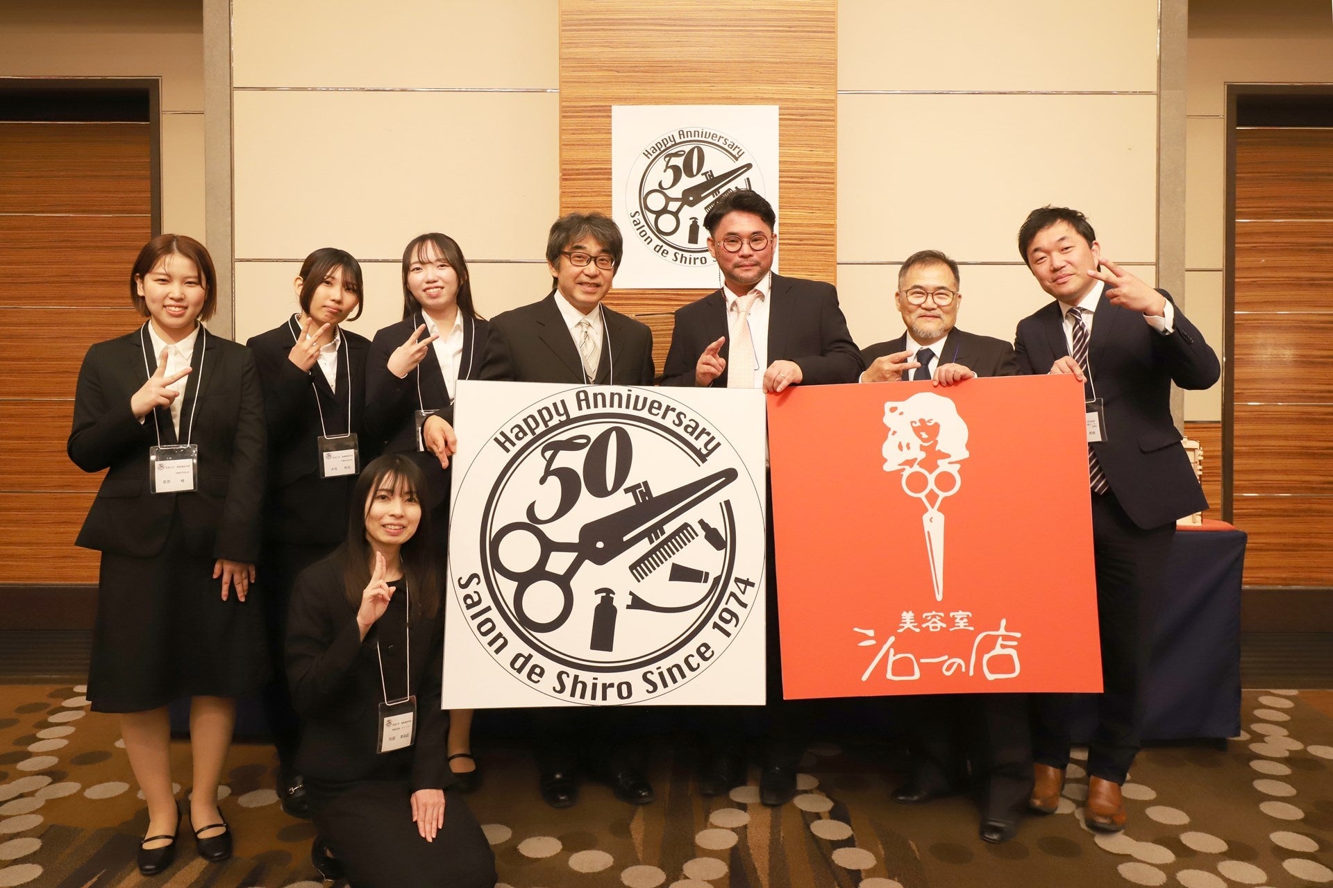 式典では、多店舗展開では50年続くことが少ないと言われる美容室の持続的経営の内容を、会長と代表取締役の対談で解き明かしました。さらに、有限会社サロンド・シローが宮城大学の伊藤研究室とその学生に依頼した50周年記念ロゴの発表を行いました。