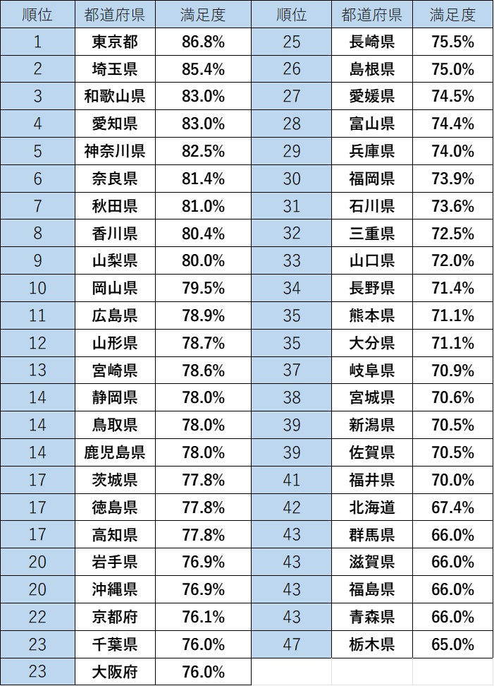 全国2,250名の既婚者を対象に「夫婦関係について全体として満足していますか」の質問をした結果、満足しているは全体の24.7%、まあ満足しているは50.4%、あまり満足していない14.6%、満足していない10.4%となり、満足している、まあ満足しているの合計は全体の75%となりました。また、満足している、まあ満足しているを合算した回答者比率(以下、「夫婦満足度」)を都道府県別ランキングでみてみると、夫婦満足度として最も回答比率が高かった都道府県は東京都(86.8%)、次いで埼玉県(85.4%)となり首都エリアが上位を占める結果となりました。一方で最も回答比率は低かったのは、栃木県(65.0%)となりました。