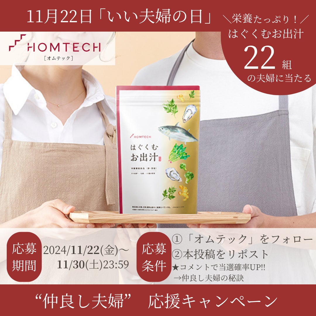 この度、日々の食事をきっかけに、夫婦仲良し♪を応援するべく、オムテックの「はぐくむお出汁」が当たる、いい夫婦の日限定プレゼントキャンペーンを実施いたします。詳細はオムテック公式Xをご覧ください。