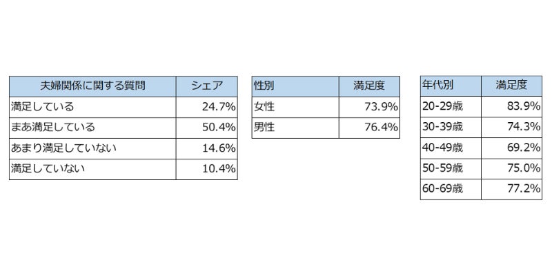 男女別で見た結果、男性の夫婦満足度が76.4%、女性が73.9%と男性の方がやや高めとなり、年代別では、20代が約84%で最も高く、40代が約70%で最も低くなっています。子どもの有無別にみると、子どもがいる夫婦の満足度が73.0%、いない夫婦が82.2%となり、子どもがいない夫婦の満足度が約10ポイント高い結果となりました。