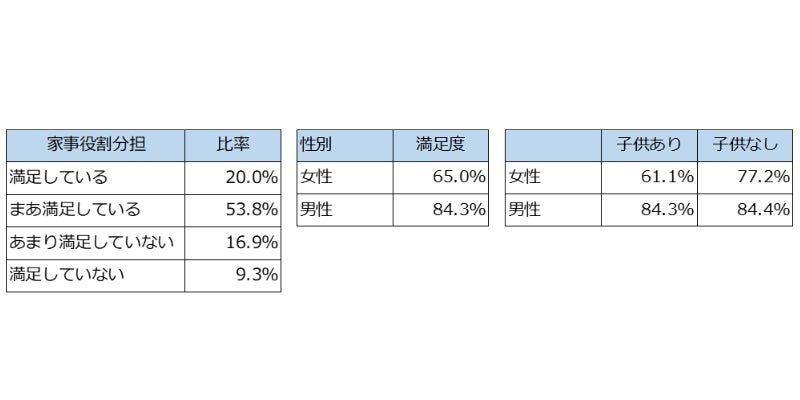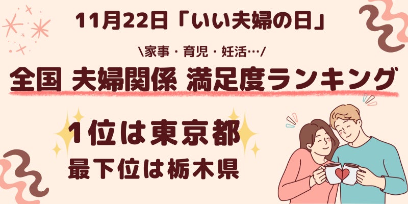 なお、都道府県別ランキングでは、家事・育児役割分担満足度の1位は埼玉県(夫婦満足度で2位)、東京都は11位でした。一方、夫婦満足度が最も低かった栃木県は42位と、家事・育児役割分担満足度も低い結果となりました。