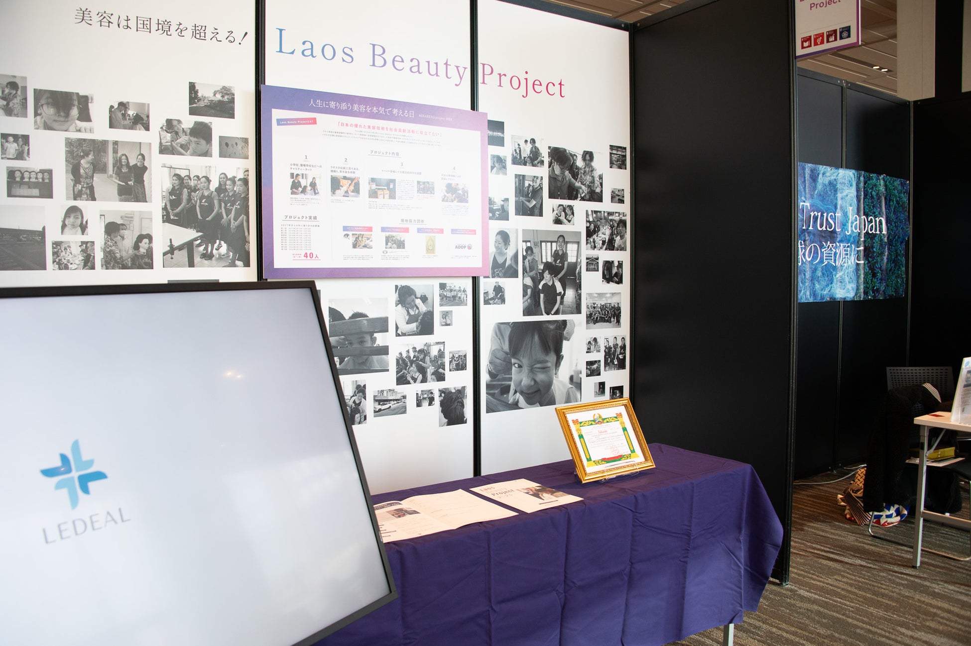 また昨年同様、SDGsの取り組みとして、カラーチューブ回収コーナーやラオスの美容・経済発展に貢献する「ラオスビューティープロジェクト」コーナー&古着回収BOKが設置されました。株式会社LEDEALでは2014年からカラーボトル回収を始め、10年間で集まったカラーボトルは総合計38.3t(38,384㎏)、総額191,917円(24.10.10現在)に達しました。捨てられるはずのヘアカラー容器は3個で浄水剤1錠分、35個でワクチン1回分となり、途上国の子供たちの支援につながっています。