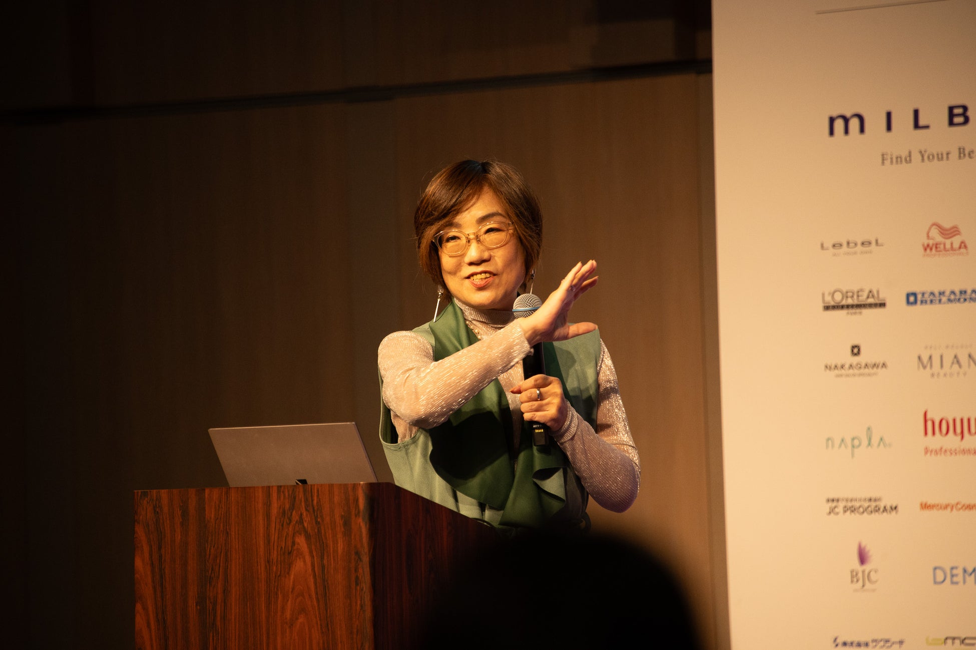 「毛髪で女性ホルモンの測定ができる検査キットではホルモンについて知ることができるので、ホルモンを軸にして会話が広がっていく。」と語られる豊原さん。金山さんは「髪の毛でホルモン値が図れるのは皆さん(美容室)の武器になる。下がっているとわかると女性ホルモンにアプローチするヘッドスパやアンチエイジングメニューを提案できる。」と会場の来場者へ語りかけました。
