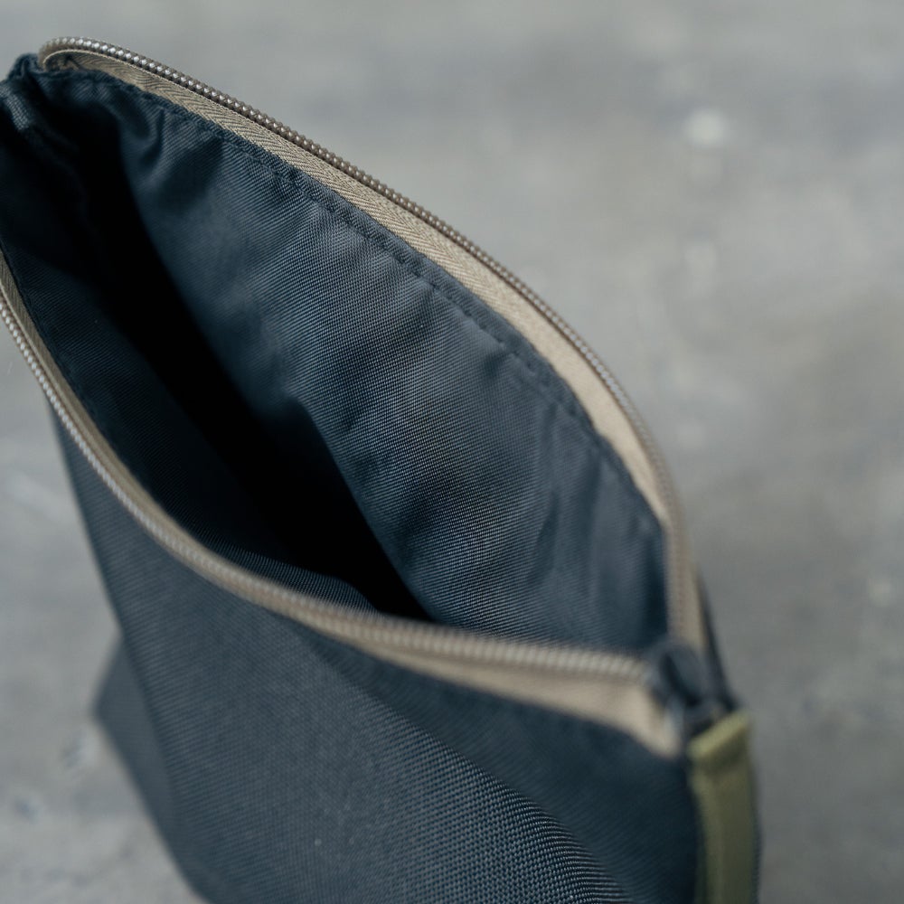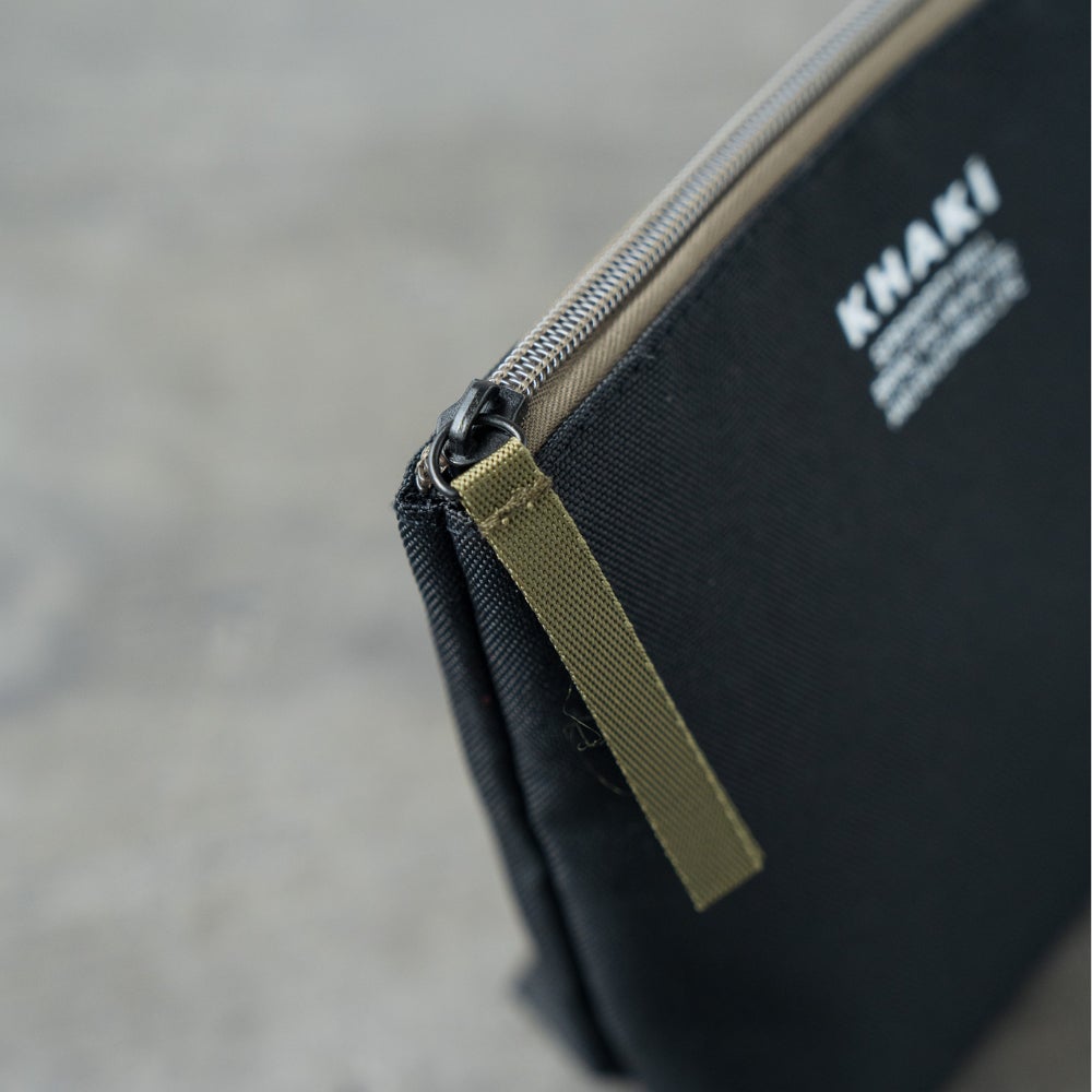 ファスナーと引手にはブランドカラーのカーキ色をワンポイントに