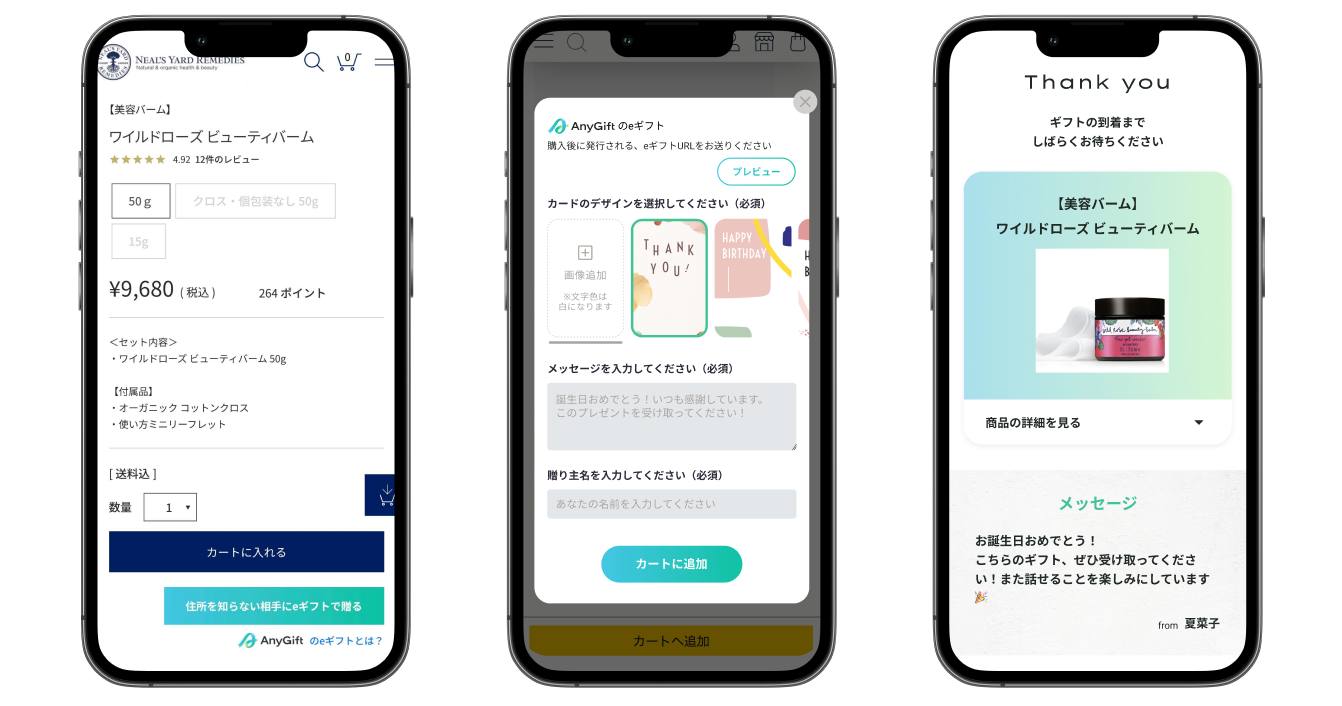 今回、AnyGiftの提供により、「ニールズヤード レメディーズ 公式オンラインショップ」にてギフトセットや人気製品がeギフトとして贈れるようになりました。