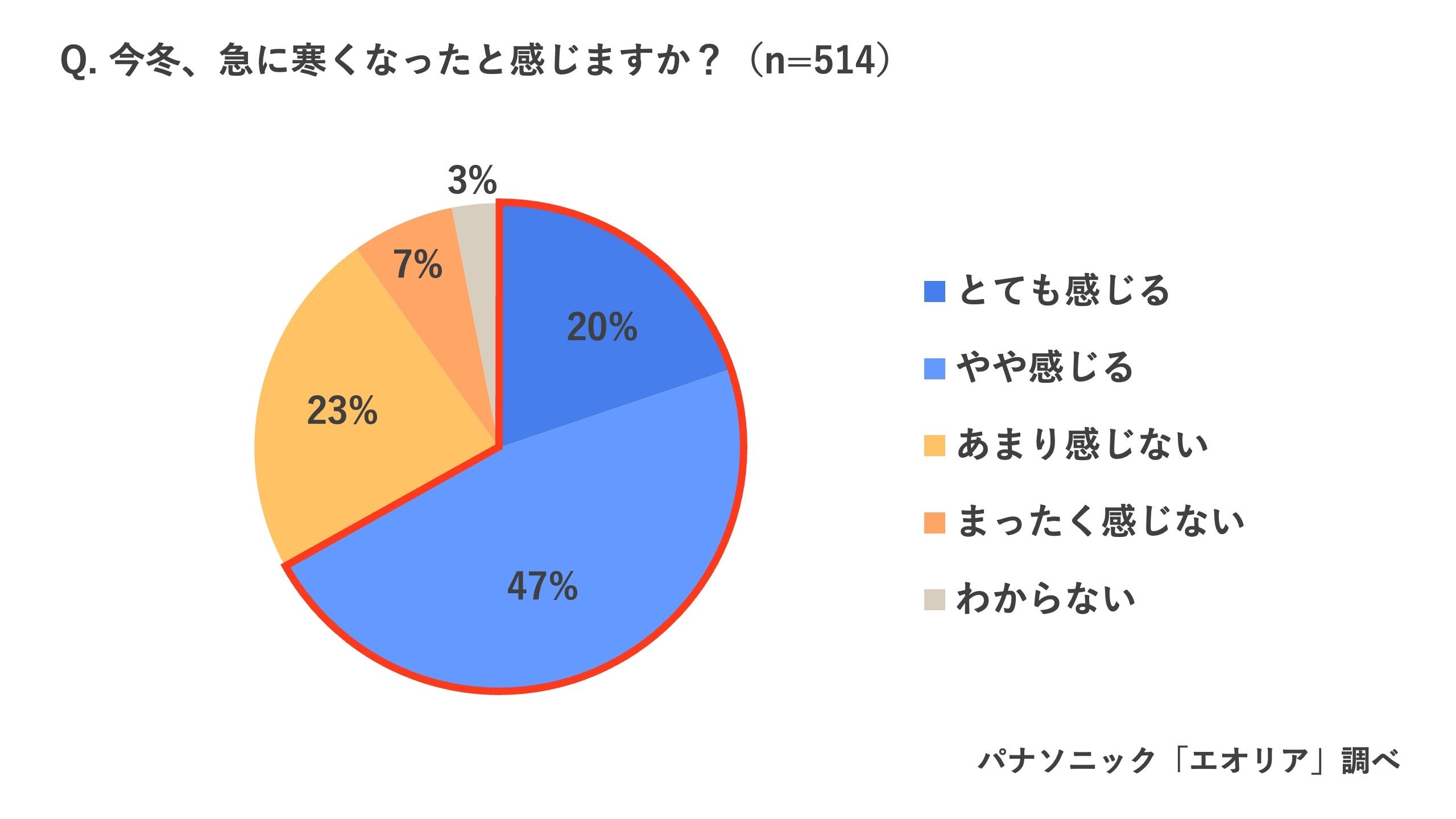「寒さ」については、秋から冬にかけての寒暖差も気になるところ。「今冬、急に寒くなったと感じますか?」という質問では、「とても感じる」20%、「やや感じる」47%と67%が急な寒暖差を感じていることがわかりました。