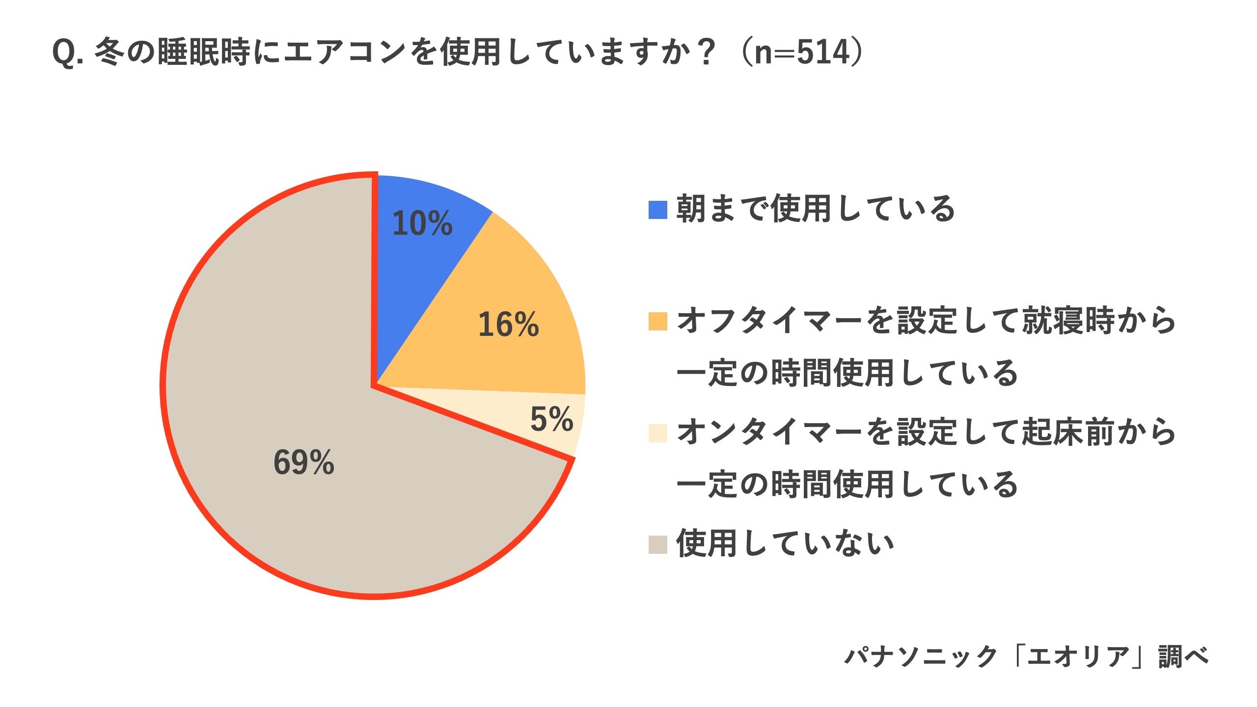 寒さで寝つけないと感じている人が多い一方で、冬の睡眠時のエアコン使用率については、69%がまったく使用していないことがわかりました。その他は、「オフタイマーを設定して就寝時から一定の時間使用している」16%、「朝まで使用している」10%、「オンタイマーを設定して起床前から一定の時間使用している」5%という結果になりました。