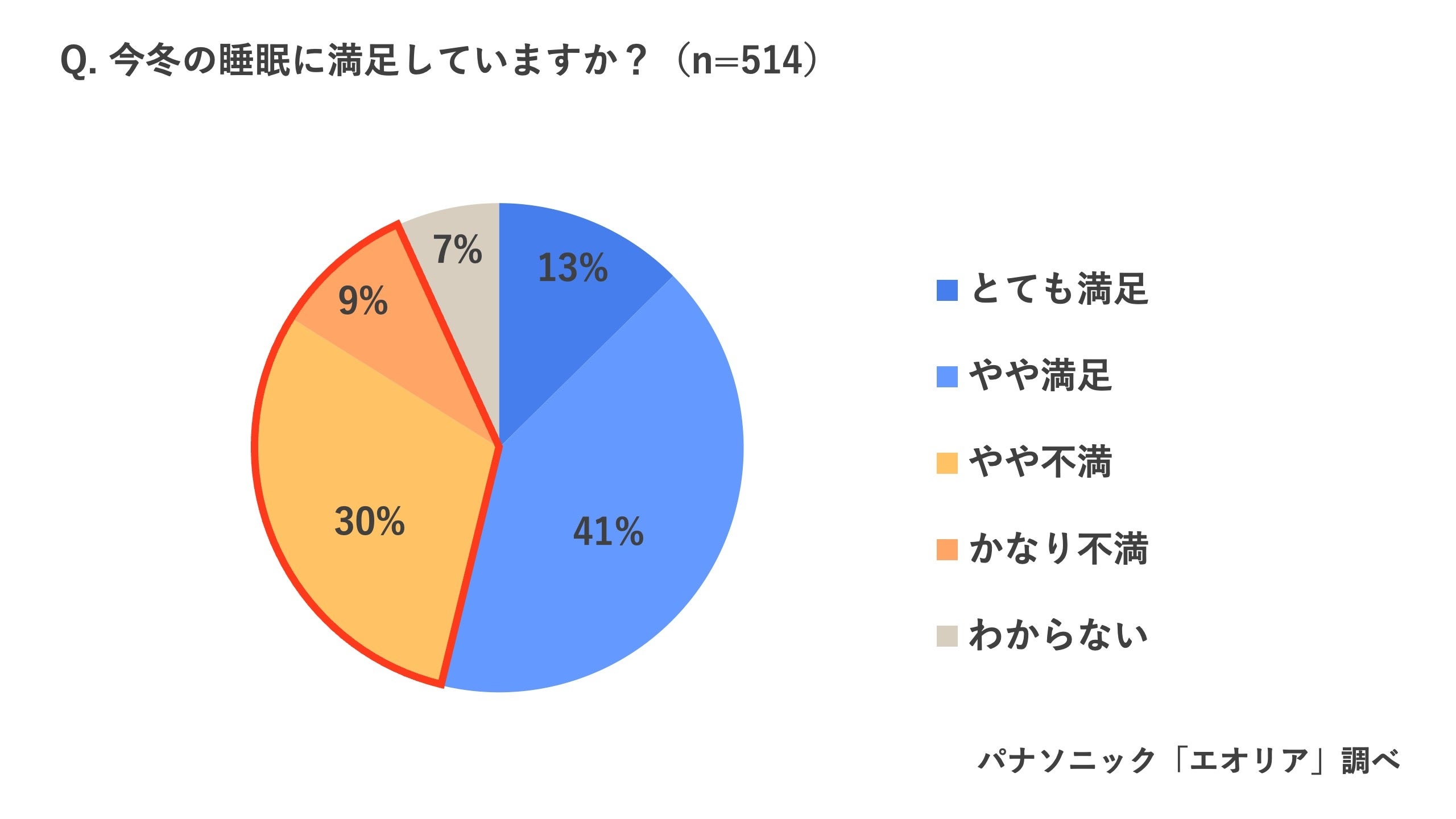 今冬の睡眠の満足度について調査したところ、「満足」が54%の一方、39%が睡眠に「不満」をかかえていることがわかりました。