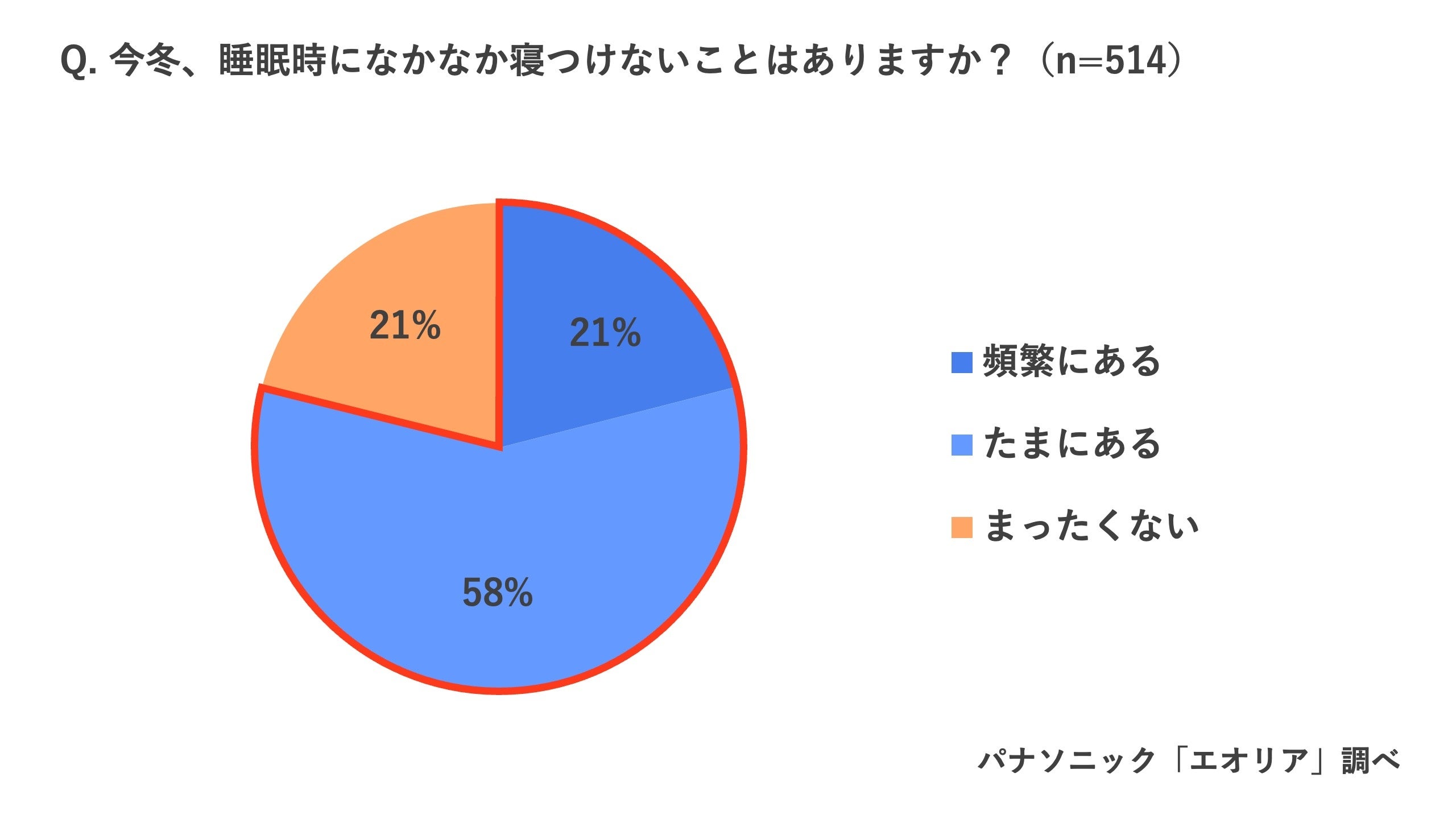 また、「今冬、睡眠時になかなか寝つけないことはありますか?」という質問では、「頻繁にある」21%、「たまにある」58%と、79%がなかなか寝つけない経験をしています。