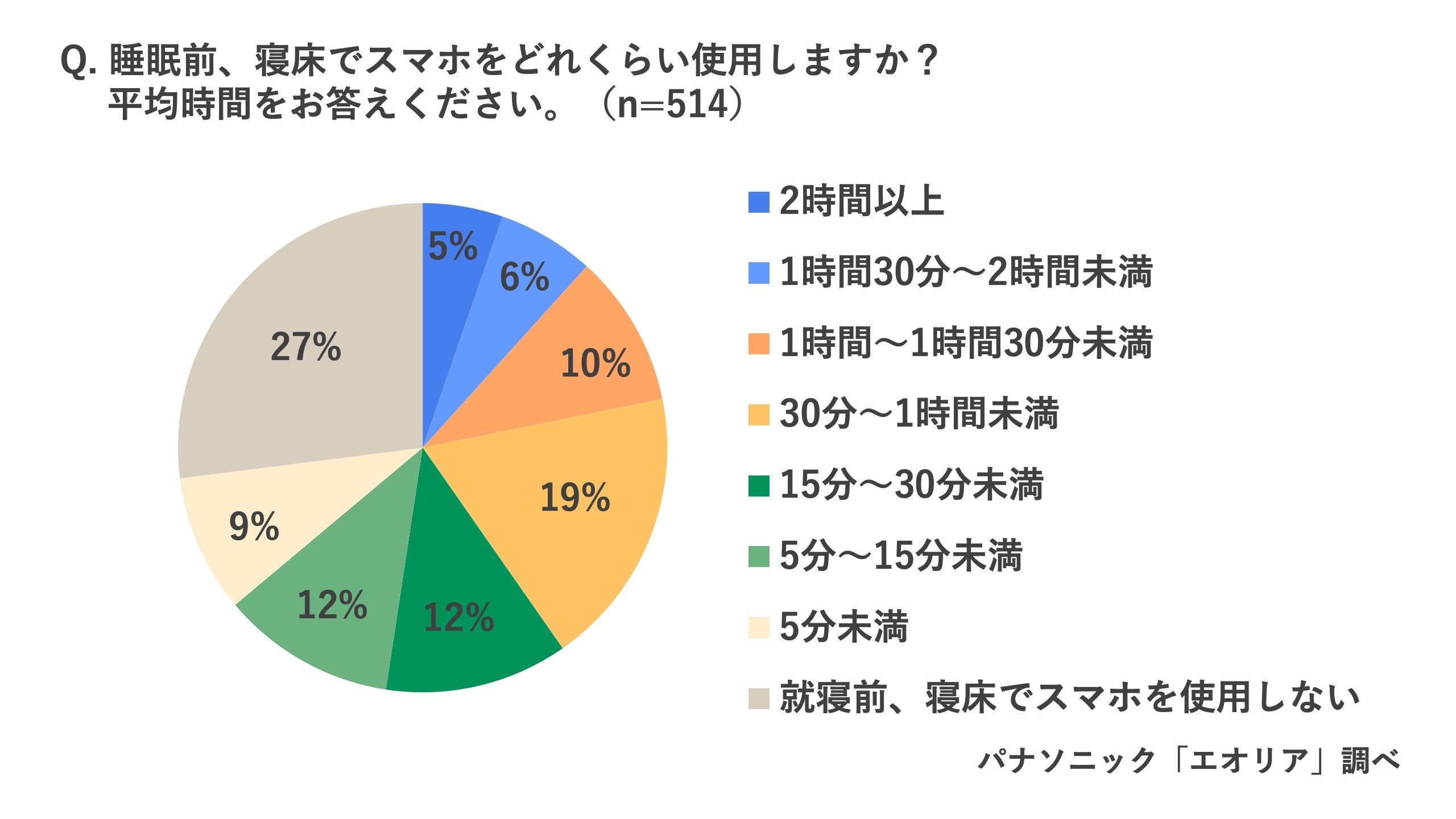 調査では、「寝床でスマホを使用しない」と回答したのは27%にとどまり、73%はスマホを使用していることがわかりました。さらに21%は寝床で1時間以上スマホをしており注意が必要です。