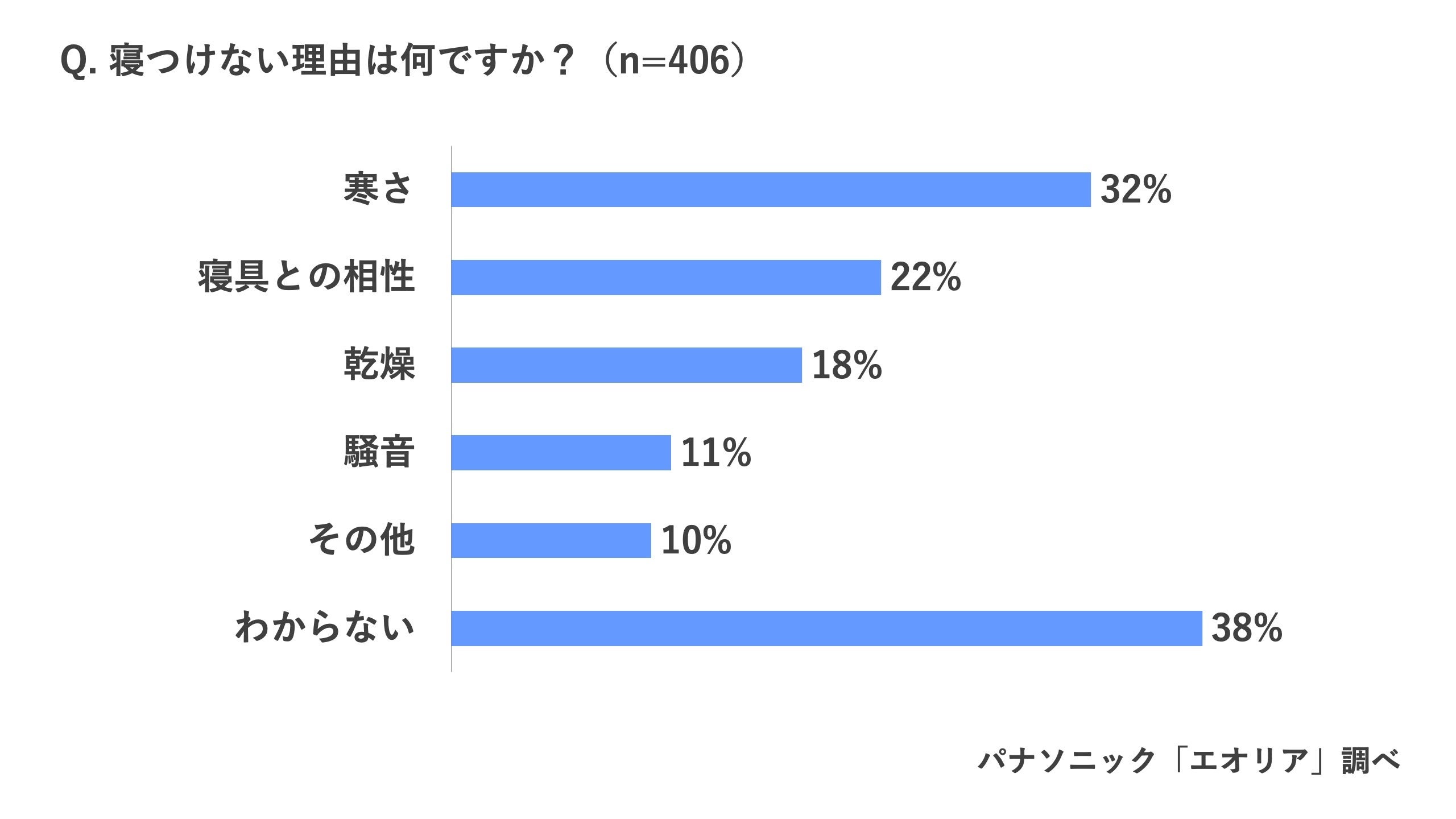 寝つけない理由については、「わからない」が最多の38%で、「寒さ」32%、「寝具との相性」22%と続きます。