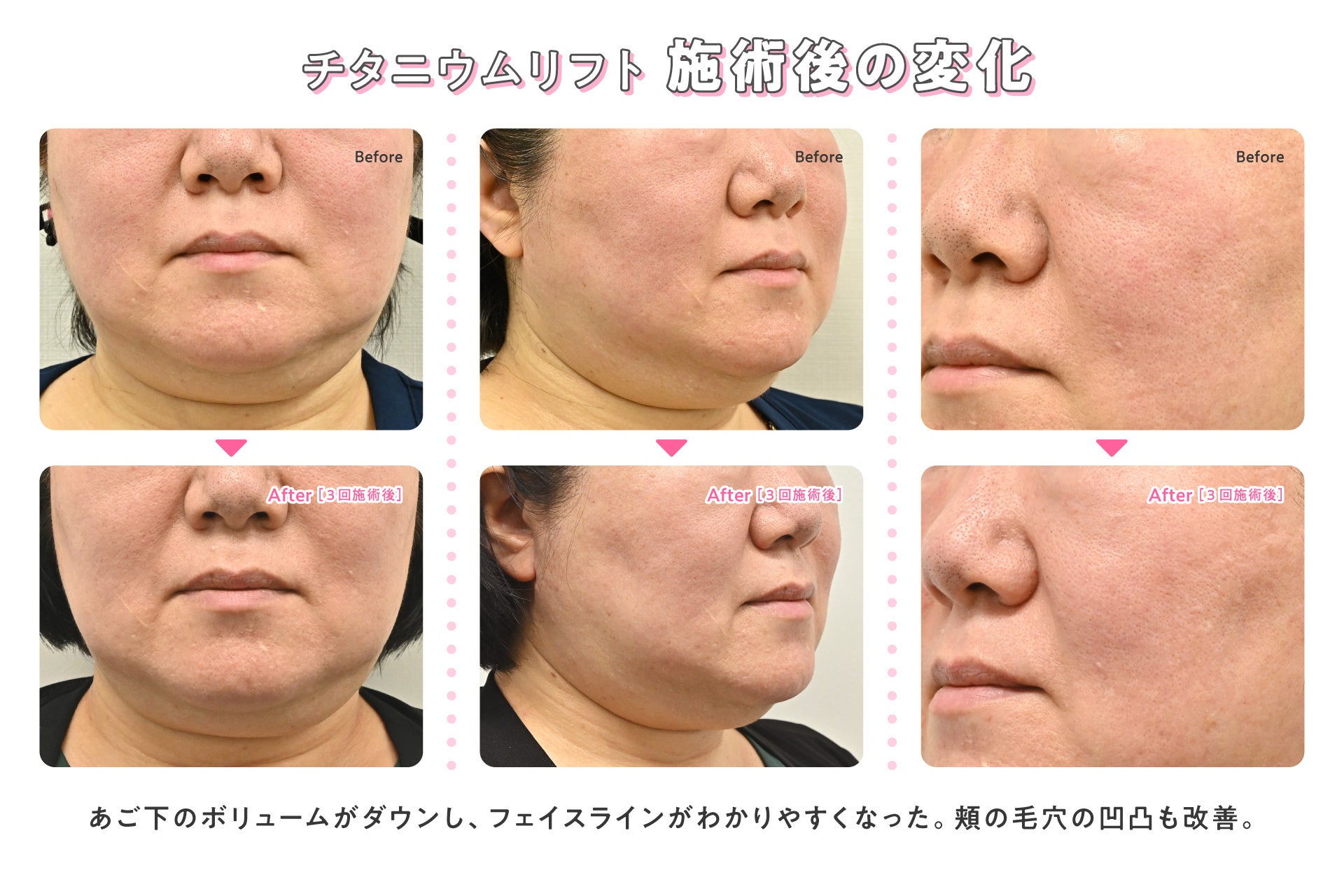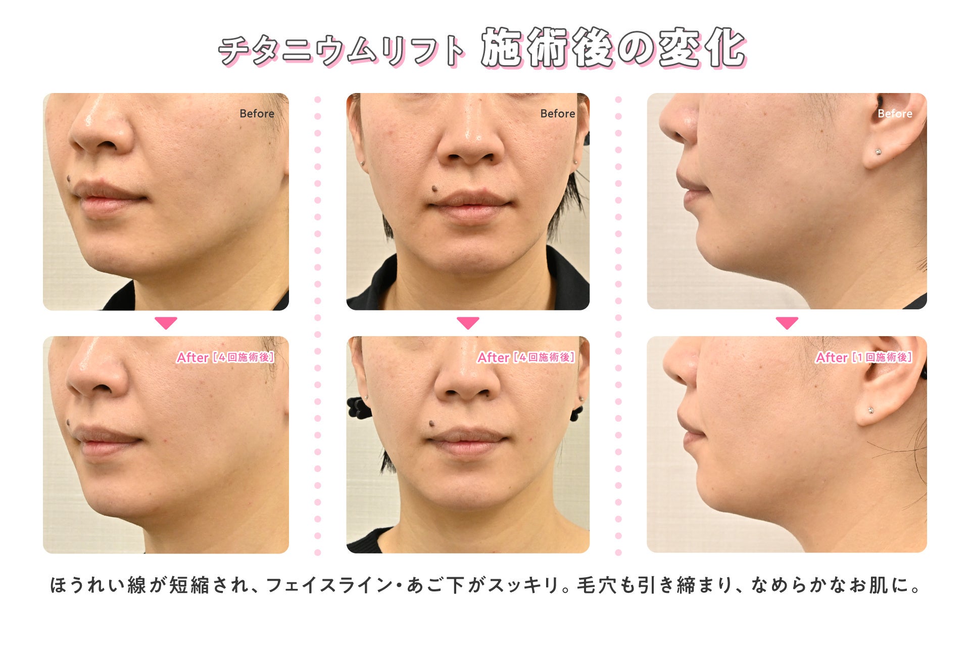HIFUに比べて痛みも少なく、施術直後の効果はチタニウムリフトの方がわかりやすいと感じます。肌質に関しては、1~2回目までは大きな変化を感じなかったものの、3回目の施術後に毛穴の変化がはっきりと現れました。特に楕円形に広がっていたたるみ毛穴が丸く引き締まり、ファンデーションを塗ったときに毛穴が目立ちにくくなり、肌の質感が変わってきたと感じています。