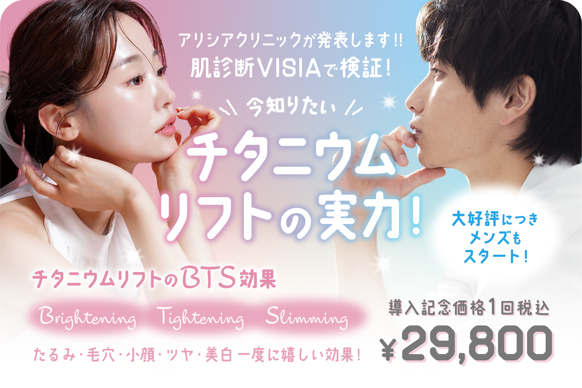 今なら、アリシアクリニックの「チタニウムリフト」を特別価格でお試しいただけるキャンペーンを実施中!この機会に、韓国で大人気のリフトアップ施術を体験してみませんか?限られた期間のキャンペーンとなりますので、お早めのご予約をおすすめします。