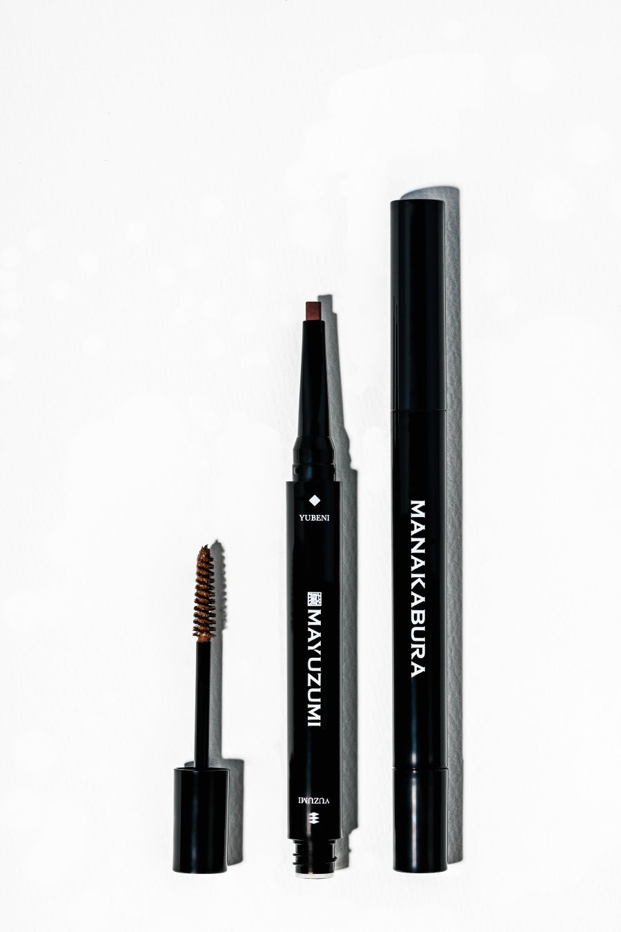 マスカラ部分の「YUZUMI」はKUROTOBI(黒鳶色)はクリアブラックを採用しており、黒髪の方や白髪が出始めた眉毛に塗ると自然に毛流れをスタイリングができます。HARIZURI(榛摺色)とSHITAN(紫檀色)はウォータープルーフ仕様で、細かいパールが含まれているため、他メーカーのアイブロウ商品に使用したとしても色が変化するカメレオンアイブロウマスカラとなっています。また、カラーマスカラとしてまつ毛に使用することもできます。