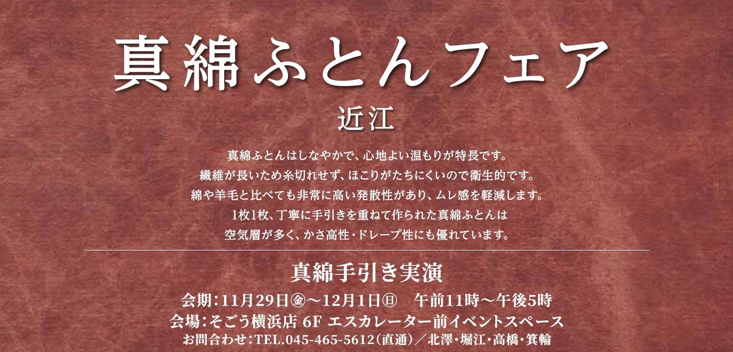 MuAtsu(ムアツ)を中心とした様々な寝具を販売する昭和西川株式会社(所在地:東京都中央区、代表:西川惠)は、そごう横浜店にて11月29日(金)~12月1日(日)の3日間限定で冬の特別体験イベント「真綿(まわた)の手引き実演会」を開催いたします。